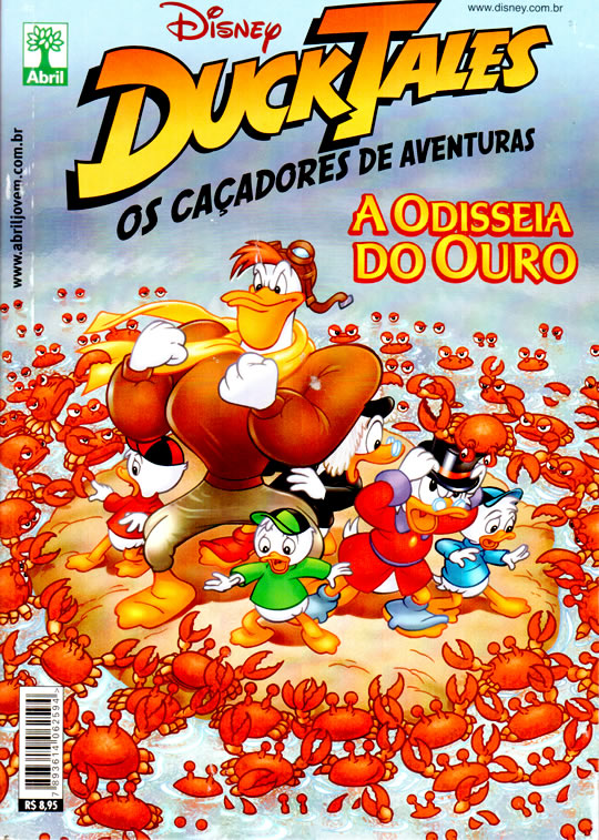 Rá! O encadernado especial da Editora Abril com a série Ducktales! Vamos lá aos detalhes que todos querem saber. A edição tem 194 páginas, com todos os setes capítulos completos da saga chamada A Odisséia do Ouro, onde o Tio Patinhas se aventura pelo mundo inteiro através de… ouro, é claro! A saga foi criada em 1991 lá nos Estados Unidos, quando o desenho ainda passava na TV inclusive. Aqui no Brasil a mesma saga foi publicada aqui entre 2001 à 2002 nas revistas Tio Patinhas 435 à 441, um capítulo por mês. Este é o primeiro encadernado até então com a saga completinha! Mas o encadernado ainda trás um bônus: Uma história de 2002, com desenhos de Daan Jippes, com argumentos de Carl Barks!