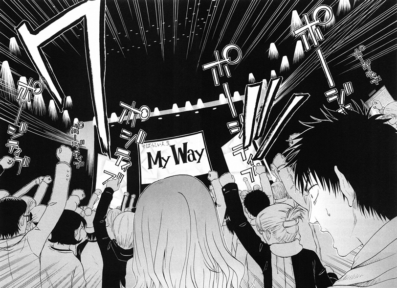 Dando seguimento, ainda tivemos o lance com a empresa de charlatões My Way que me pareceu um filler de anime. Evidentemente que isso é impossível no mangá, mas essa história toda não ajudou a trama a andar de forma alguma na minha visão. Achei bem desnecessário o Sato ir até o lugar e sair dele mais alienado do que antes. A ida da Misaki até lá então só serviu pra terminar a piada e no fim o personagem continua andando em círculos, sem saber pra onde vai, sem saber em quem confiar e com uma maluca no pé que não entrega o jogo e nem o… melhor deixar pra lá.