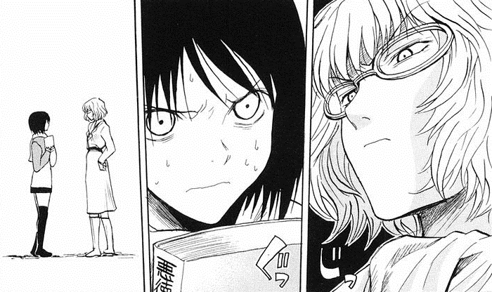 Depois tivemos uma sessão no divã particular do casal de protagonistas e de início achei que a Misaki e ele fossem passar a edição inteira discutindo como a vida do garoto é uma porcaria e coisa e tal. Infelizmente a melhor parte do volume na minha opinião acabou não durando muito. Mas ao menos foi por um motivo mais do que justo, pois agora ficou definitivamente claro que a Misaki também passa por algo parecido com o que vive o Hikikomori. Toda vez que alguém toca no assunto sobre o que ela faz da vida ou sobre amigos e colégio a garota se esquiva ou foge para não ceder respostas sobre o seu passado, também vale lembrar que no segundo volume ela chegou a declarar que tinha problemas com a mãe, então nada mais óbvio do que concluir que a menina também tem a sua dose de complexos.