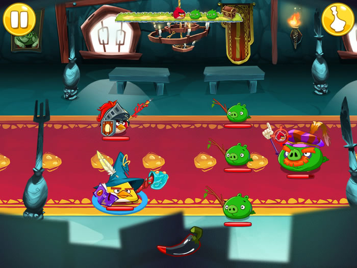 Quanto aos pássaros e suas classes, é legal mencionar que próximo do último castelo há o Dojo da Águia Enorme, onde você faz a atualização dos chapéis. São 3 atualizações, sendo a primeira a de Veterano, custando 500 porquéns por chapéu, a segunda Elite por 2.000 porquéns cada, e a terceira e última Mestre pelo roubo de 300 moedas de ouro por chapéu. Para ter acesso ao Dojo, você precisa enfrentar o Red em uma “batalha pela honra”, onde você só pode selecionar 1 pássaro, e não pode usar poções.