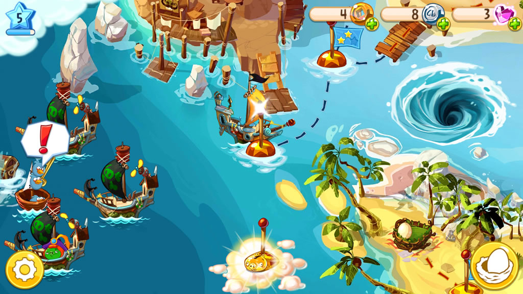 Dito isso, talvez tenha dado a entender que o jogo é molezinha. Veja bem, é um game mobile, então não é para ser algo extremamente complicado. Ele realmente não é nada difícil, mas está meio longe de ser entediante ao ponto de nem precisar prestar atenção ao que você está fazendo. Domingo cheguei a um porto pirata que parece que só funciona as segundas-feiras – é como um desafio semanal – e quem disse que consegui vencer essa fase? São cinco ou seis etapas de batalhas contra os porcos. Só fui até a segunda batalha nas duas tentativas.