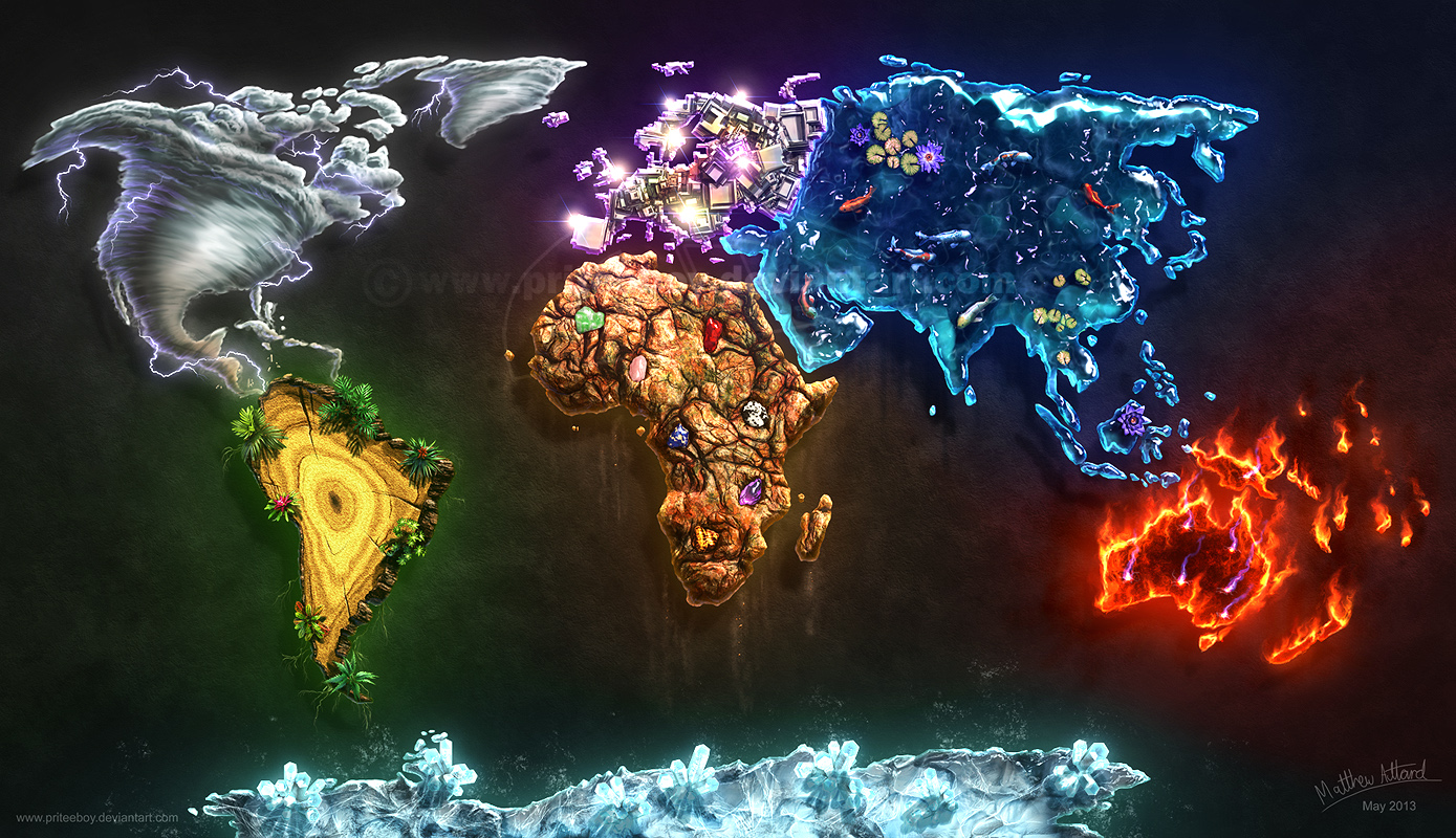 África: terra, Europa: metal, Asia: água, América do Norte: vento, América do Sul: madeira, Austrália/Oceania: fogo e Antartica: gelo! Visualmente é de se impressionar. Na página da arte há um texto do autor explicando a escolha do elemento de cada continente.