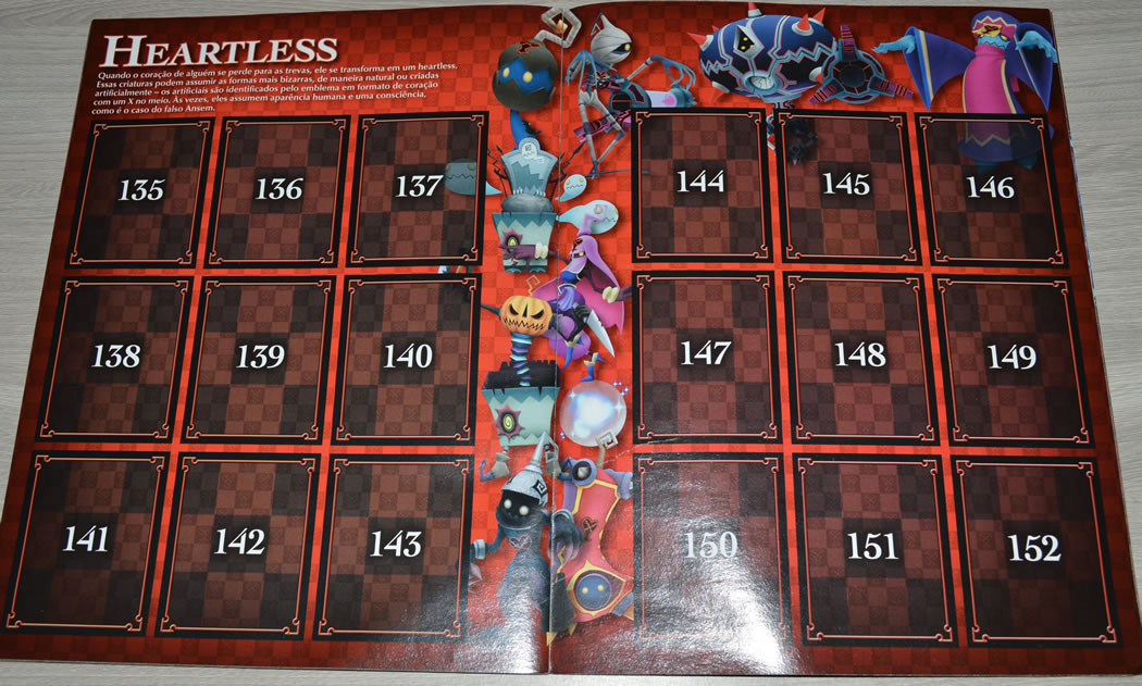 Ele serve como uma espécie de guia básico ao universo de Kingdom Hearts. Quem está na espera do terceiro game e precisa relembrar a pilha de personagens que existem e das linhas narrativas já criadas, só o álbum, sem figurinhas já é interessante. As páginas são bem organizadas, no estilo de uma galeria enfileirada e organizada para apresentar inimigos, vilões, os mundos da Disney que já foram apresentados até aqui. É serio, ficou animal!