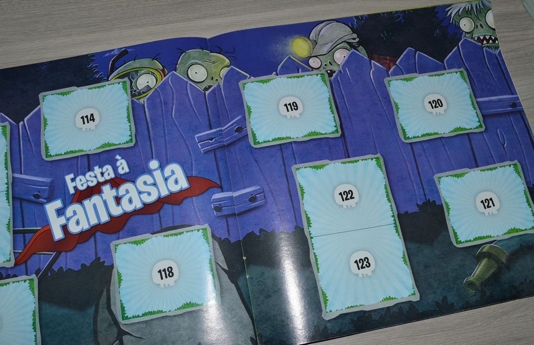 Voltando ao álbum, ele é bem simples, sem muitos textos, mas com a mesma quantidade de figurinhas do álbum de Kingdom Hearts. Ou seja, são 180 figurinhas para cada álbum. Alias ainda não tinha notado, mas as figurinhas da Abril são miudinhas, menor do que um padrão que vi em outros álbuns ano passado. Não que isso seja ruim, pelo contrário, achei até melhor, as páginas cabem mais figurinhas ou ficam melhores reorganizadas para caber artes internas. E o álbum do Plants vs Zombies é num formato quadradão, o que chama uma atenção maior da molecada na banca, enquanto o de Kingdom Hearts tem o formatão americano padrão, mais sóbrio.