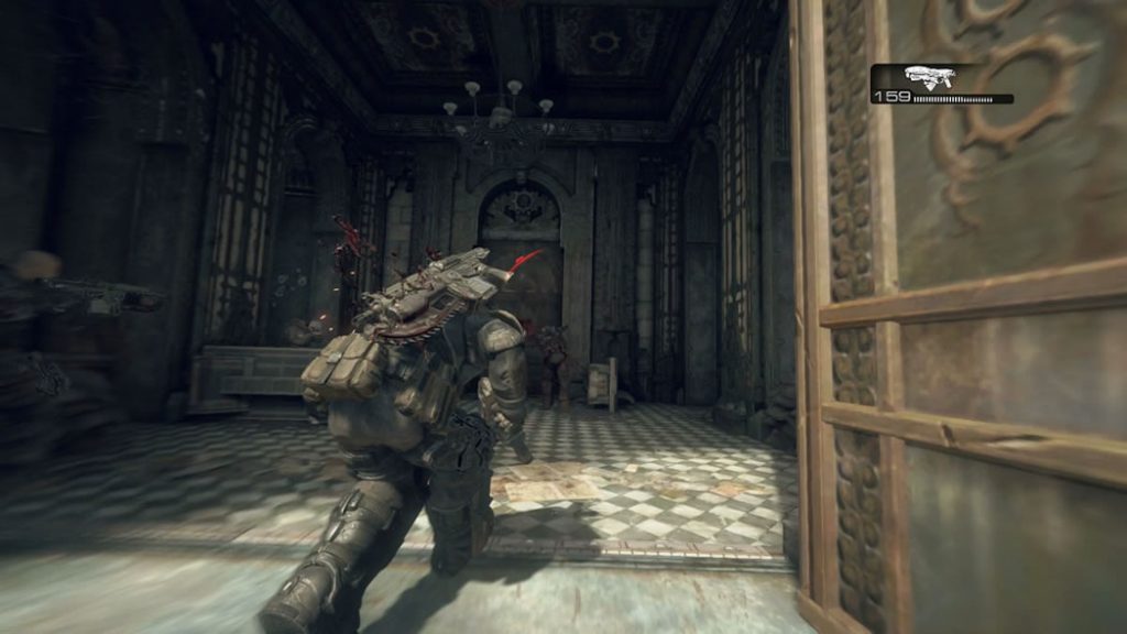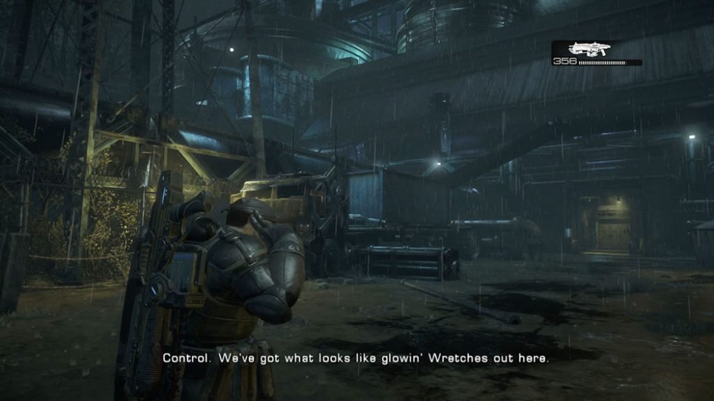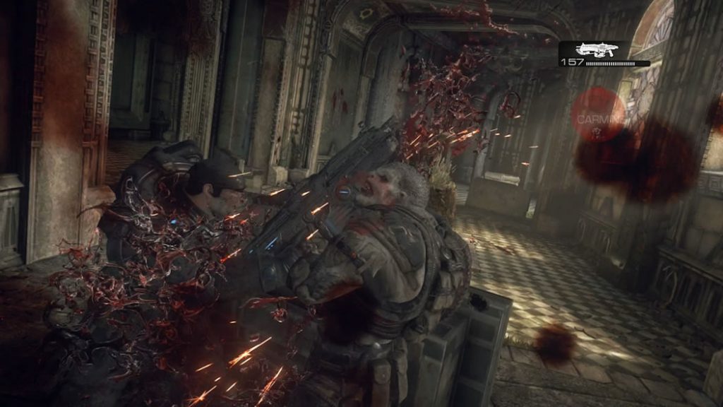 Eu apenas senti falta de algumas mecânicas que acabei percebendo e lembrando que só vieram em games posteriores, como a possibilidade de colar a granada em qualquer superfície (mas ainda dá para colar nos inimigos) e de ao saltar sobre uma cobertura para conseguir dar um chute, meio que empurrão, num adversário que estiver contrário a esta cobertura (isso no multiplayer era um movimento fatal para quem estivesse relaxado na cobertura). Tirando estes dois fatores, está tudo ali, coberturas que “colam” o personagem, recargas com dano extra se realizadas no tempo certeiro, a corridinha com tela colada na sua bunda, as armas mais clássicas, com direito a Gnasher apelona, com os companheiros bots que não servem pra muita coisa, ou com inimigos com a inteligência artificial meio questionável as vezes, porém totalmente brutais – eles avançam sem medo de morrer, causando tensão ao jogador. E tudo isso realmente fez parte da história desse primeiro Gears of War. Não são elementos que poderiam ser eliminados a meu ver.