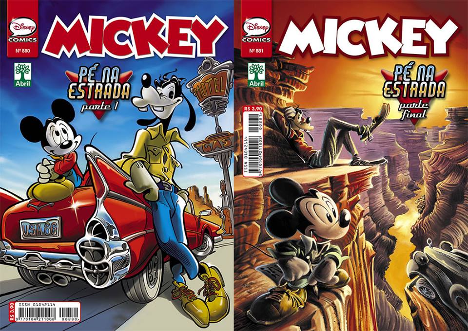A HQ de 65 páginas, com roteiros de Fausto Vitaliano (Donald Duplo) e com os desenhos incríveis de Paulo Mottura (Tio Patinhas Moby Dick) saiu na Itália em junho e chega agora em dezembro ao Brasil, em duas partes na mensal do Mickey. Ou seja, ela começa em dezembro e termina na edição de janeiro. Afinal a revista do personagem tem apenas 50 páginas, então não cabe ela inteira em uma só edição. E aqui a HQ foi traduzia tal qual o livro também se chama oficialmente: Pé na Estrada. As capas de ambas as edições já foram divulgadas:
