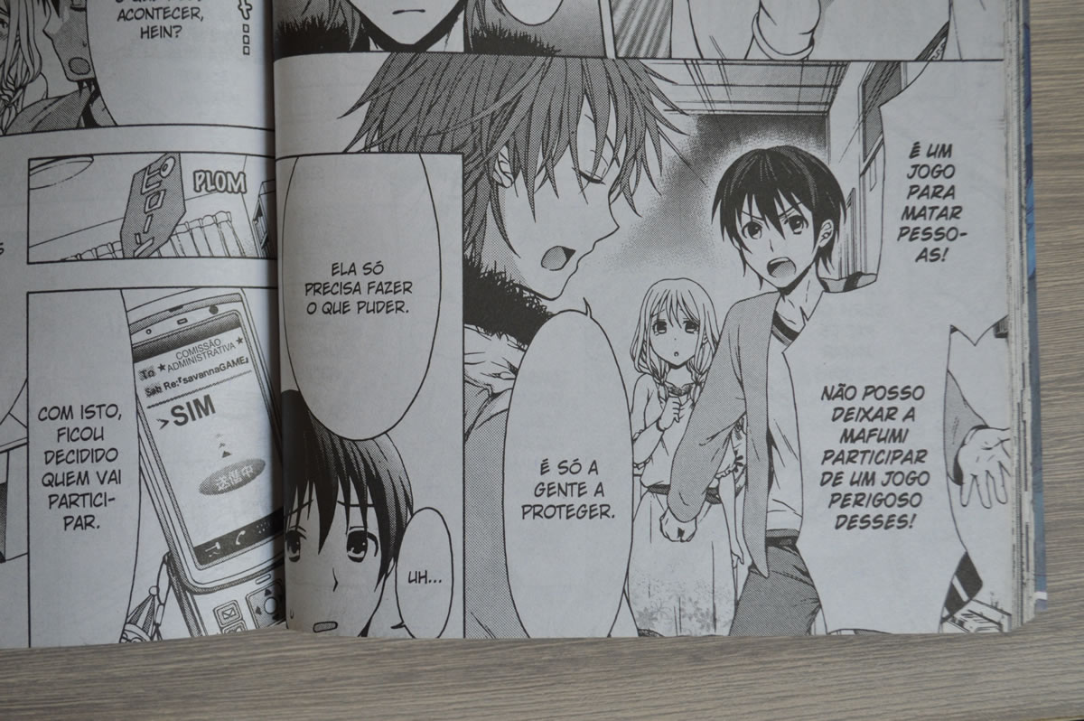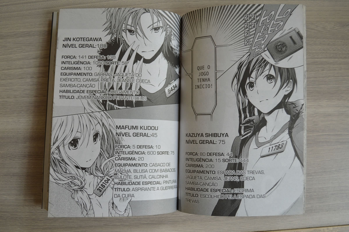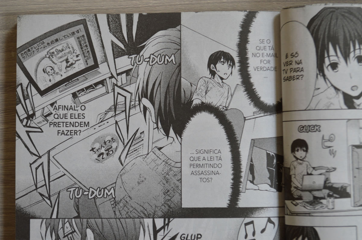 Aqui o mangá impressiona um pouco, pois o leitor acha que só porque as regras permitem o assassinato de pessoas, os protagonistas da história não vão necessariamente matar outras pessoas. Bem, ledo engano achar isso. Jin, o melhor amigo do Kazuya nem é surpresa, pois desde o começo ele tem essa aura meio psicótica, mas assim que a disputa começa, eles se veem encurralados por uma gangue e ao fim da primeira batalha deles, os jovens acabam matando seus adversários. Jin com um sadismo preocupante, devo dizer, já Kazuya o faz sem muita escolha, com o auxílio de sua espada falante, que lhe ensina um pouco sobre sobreviver primeira, refletir sobre a vida do adversário depois.