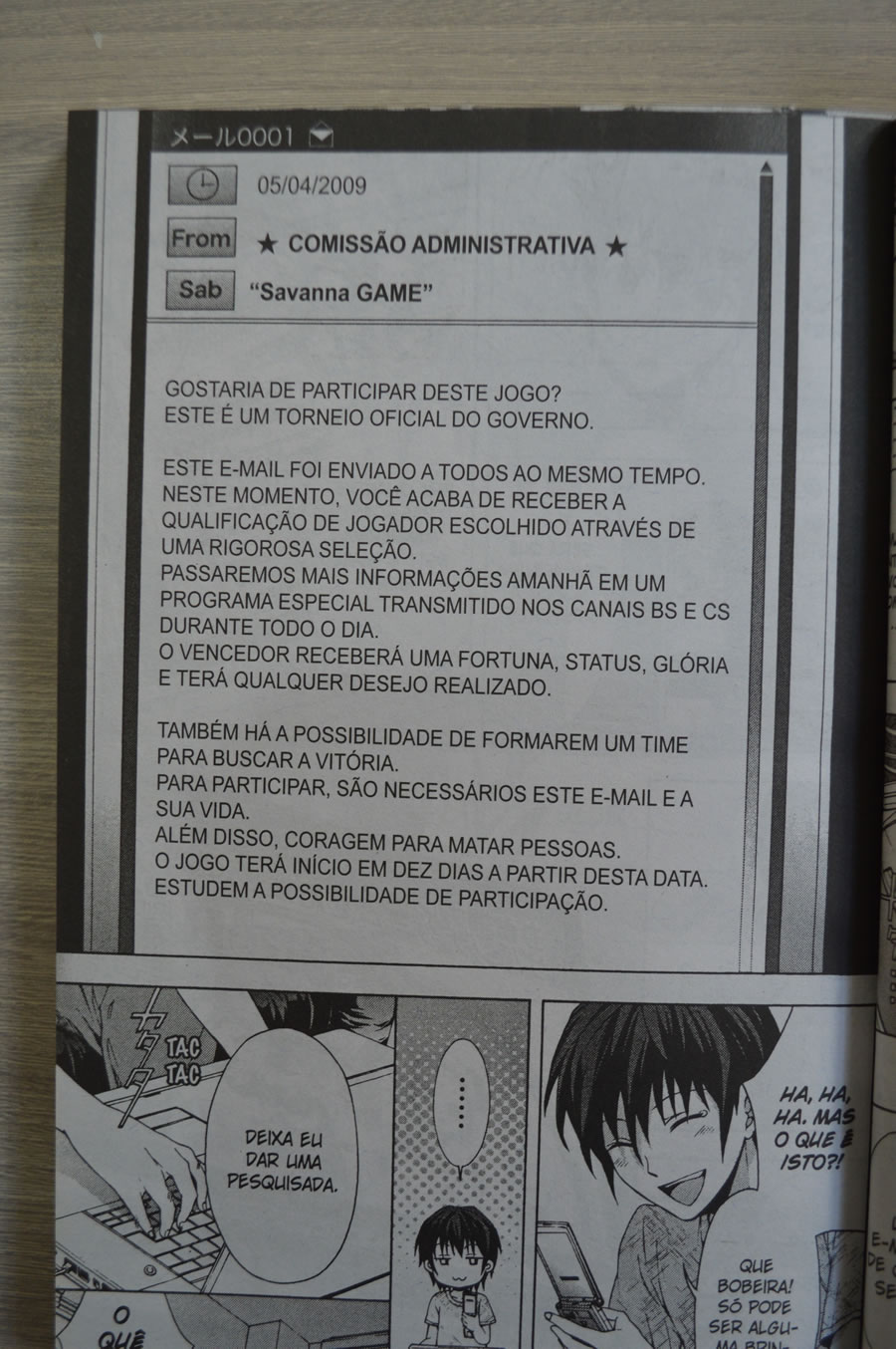 O leitor pode estranhar essa premissa, mas os autores (roteiro de Ransuke Kuroi e arte de Eri Haruno) cientes disso também inserem estas observações sobre a perspectiva do protagonista da história, Kazuya Shibuya. O jovem é um dos milhares que receberam o convite para participar do Savanna Game. De cara ele acha que é uma piada, mas tudo muda quando canais de televisão passam a anunciar, transmitir e explicar as regras e como os jogos irão funciona, dando assim autenticidade aos convites que tanta gente recebera.