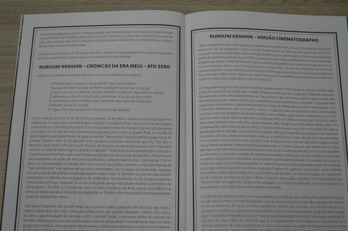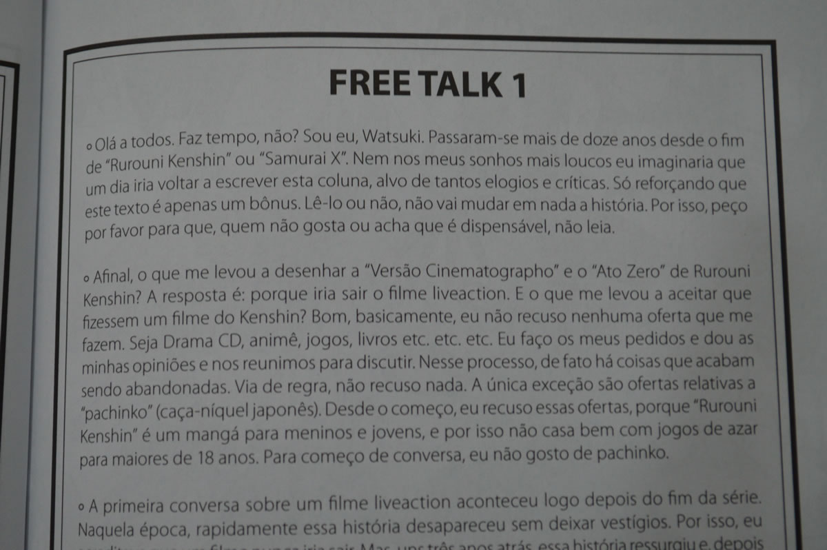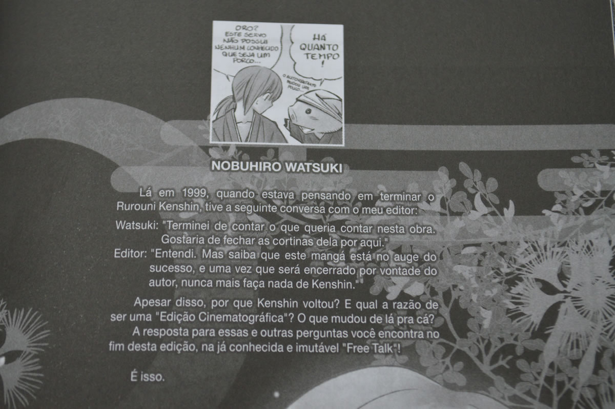 Alias eu gosto do Nobuhiro Watsuki justamente por essa conversa de bastidores que ele faz. Não havia ligado os pontos inicialmente mas conheço o autor por conta de uma outra obra dele, que este sim eu colecionei: Buso Renkin! Também foi lançado no Brasil pela JBC há muitos anos atrás (também há um kit completo no mangá na Saraiva). E o autor fazia muito disso como extras no volumes de Buso Renkin. Conversar com os leitores sobre suas ideias e enredo do mangá. Sempre achei muito legal isso, pois é uma forma da gente entrar dentro da mente do autor, mesmo que seja só um pouquinho.