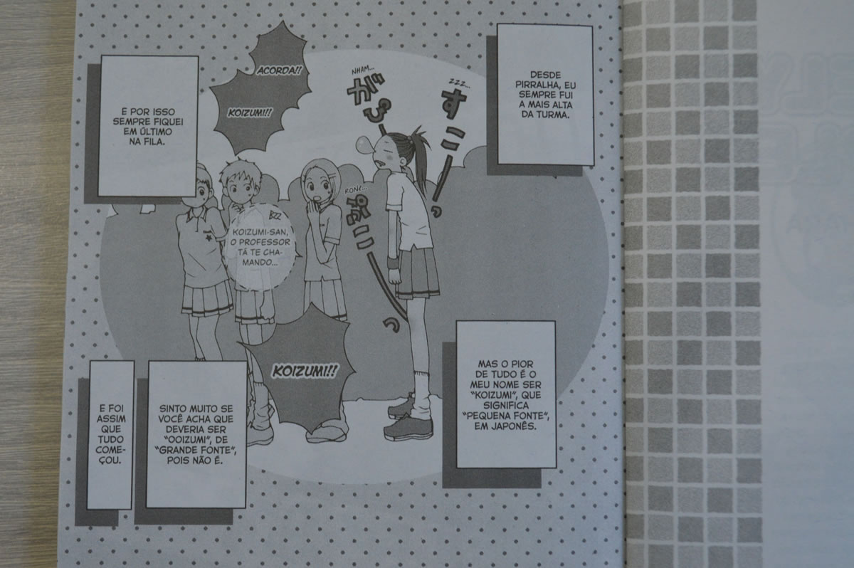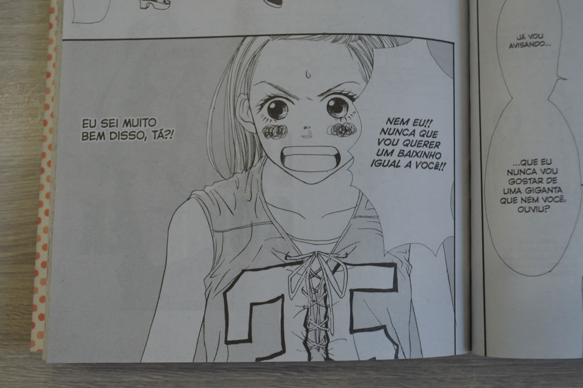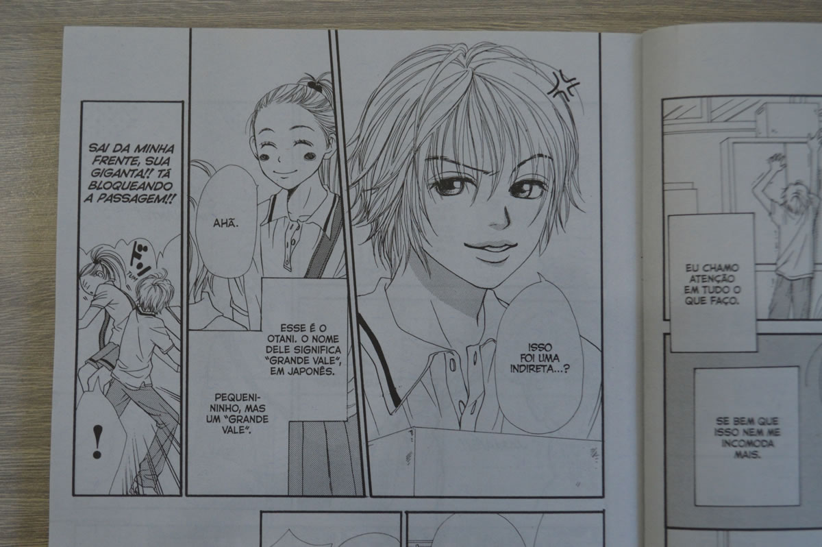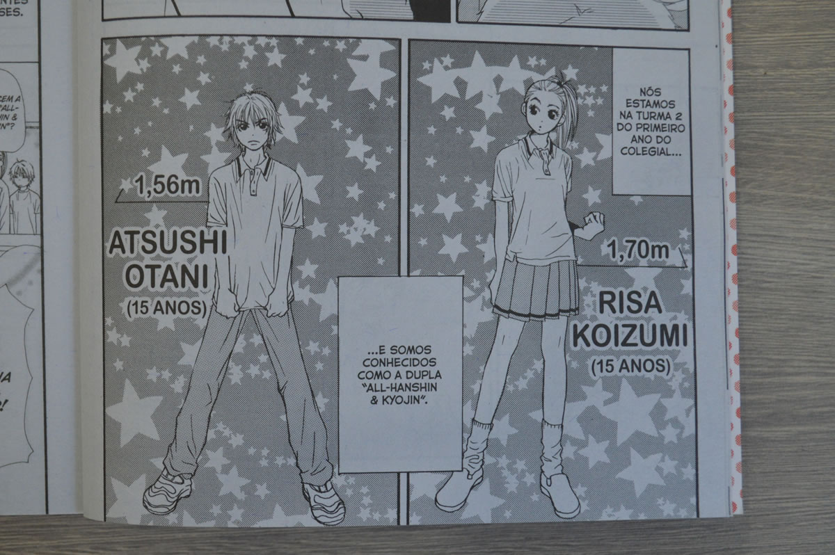O mangá abre com essa premissa de uma garota realmente alta (1,70m), Risa Koizumi, que é amiga desse garoto realmente baixo (1,56m), Atsushi Otani e como ambos se relacionam, sendo de uma mesma classe. E é legal que os nomes japoneses tem aquela coisa de terem outros significados, então o da garota significa “pequena fonte” e o do garoto “grande vale“, então por aí o leitor já percebe que a proposta do mangá é trabalhar essa coisa de “opostos”, mas sempre em um bom tom de humor. No sentido de ser engraçado e não um problema grave na vida destes personagens, sem aquela coisa de “crise de aceitação”.