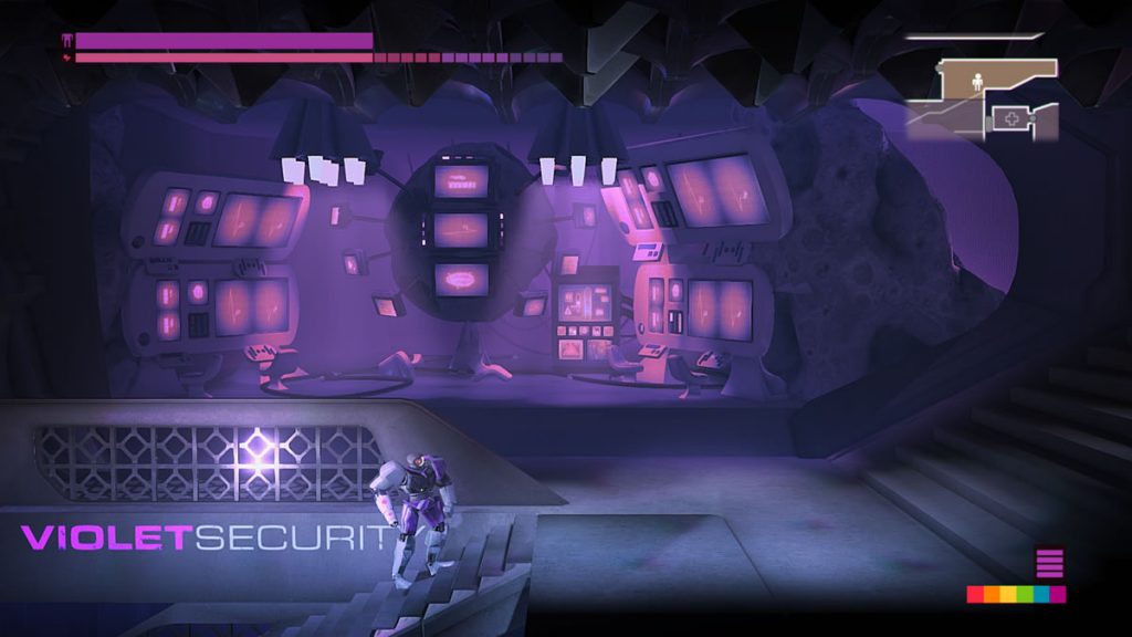 Existem assim alguns elementos de puzzle em Headlander. Seguindo a temática de super cores, existem ao longo do game um sistema de segurança baseado na hierarquia de cores. Vermelho, Laranja, Amarelo, Verde, Azul e Violeta. Violeta abre as portas de todas as cores mencionadas antes dela, enquanto vermelho abre apenas portas vermelhas. O que define a cor do jogador para abrir uma porta é a cor do corpo do robô que você estiver “vestindo”. Claro que não espere encontrar um robô violeta, que abre qualquer porta, antes do último ato do game.