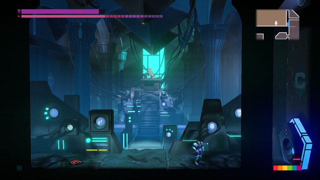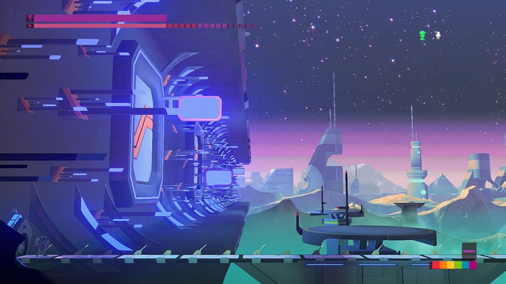 O game segue um estilo metroidvania, apresentando uma jogabilidade 2D (side scrolling) na qual o jogador precisa ir e vir por algumas áreas, descobrindo novos meios de abrir novos caminhos – nesse caso portas de cores distintas – para que a aventura siga adiante. O combate se dá por meio de batalhas com armas à laser, ainda que exista alguns elementos de combates de curta distância, usando socos e investidas, entre algumas outras técnicas que não são tão utilizadas, mas que estão ali como opção. No geral, o jogador irá se encontrar 99% do tempo atirando nos inimigos.