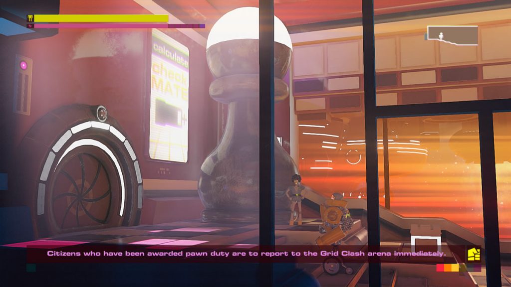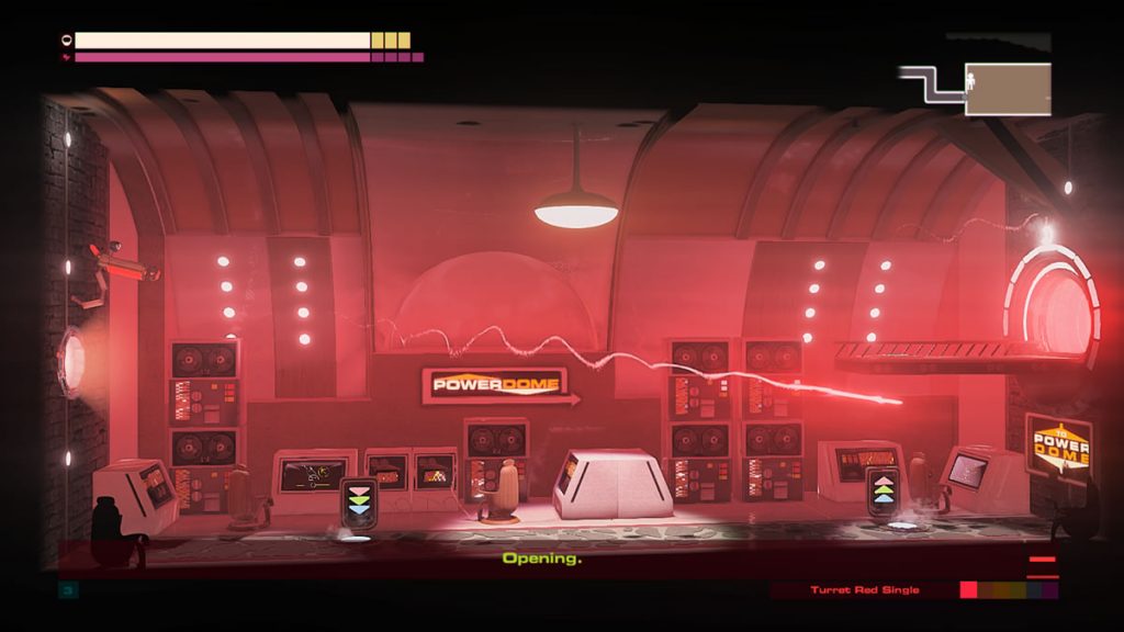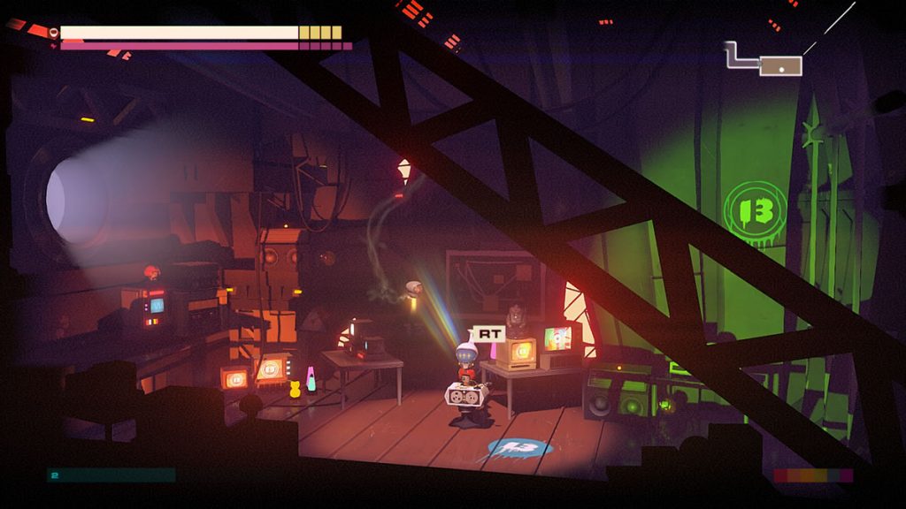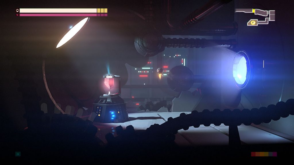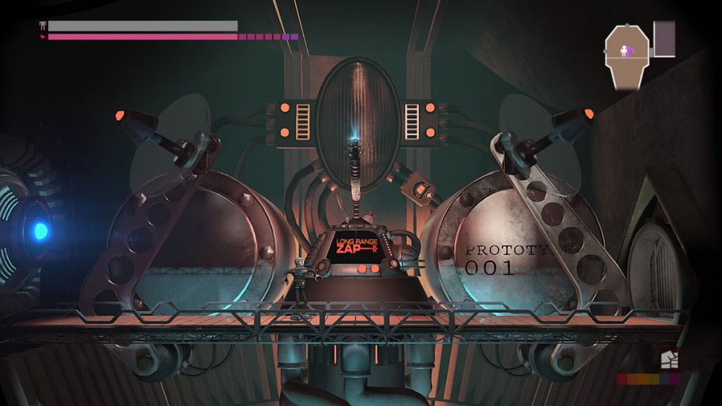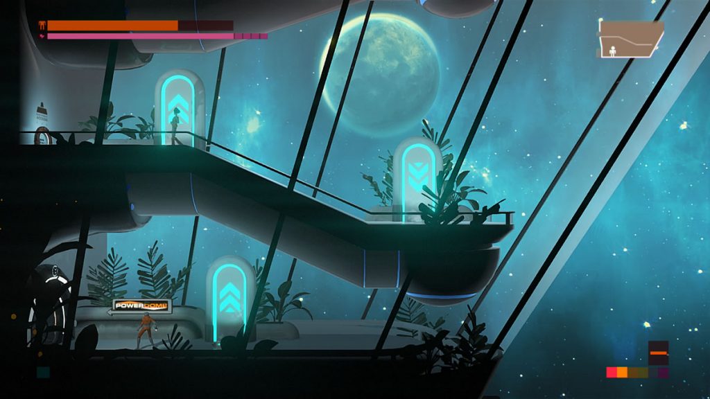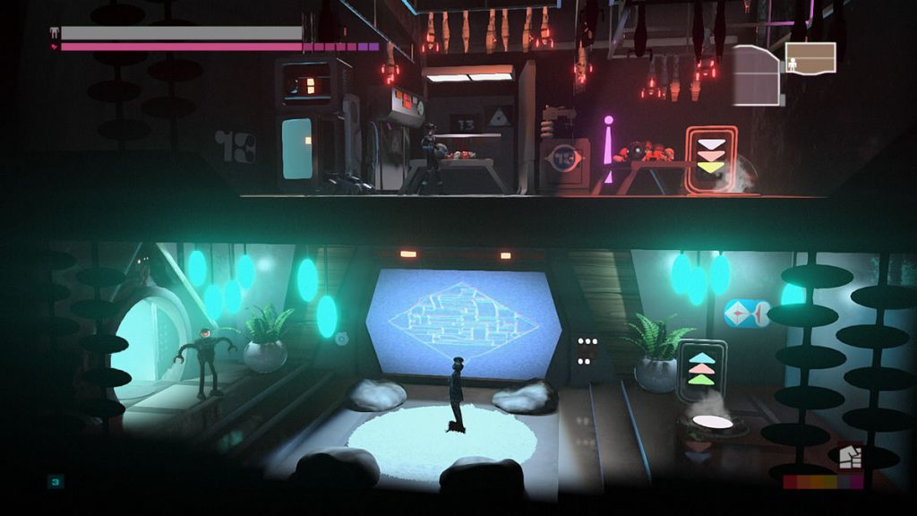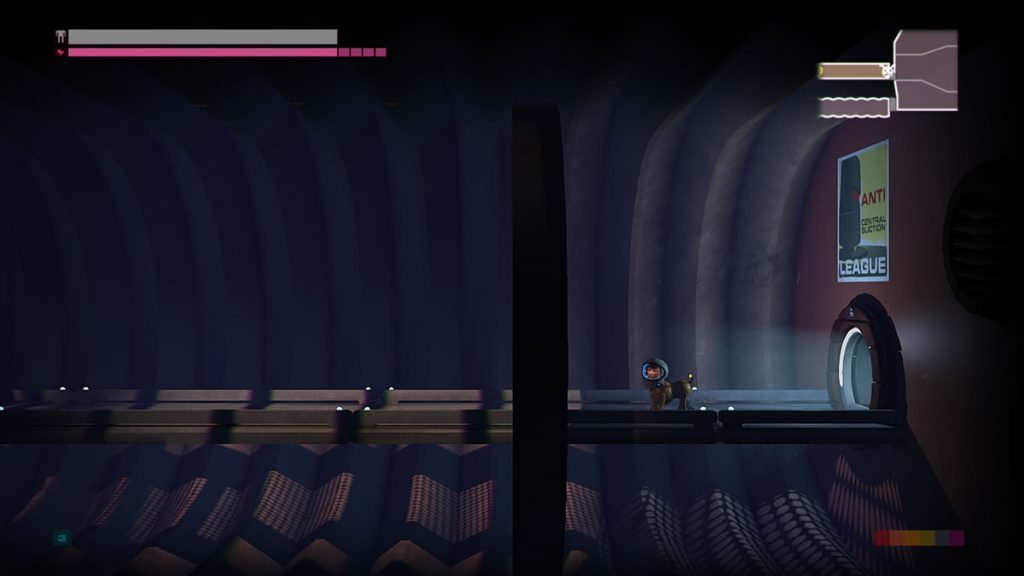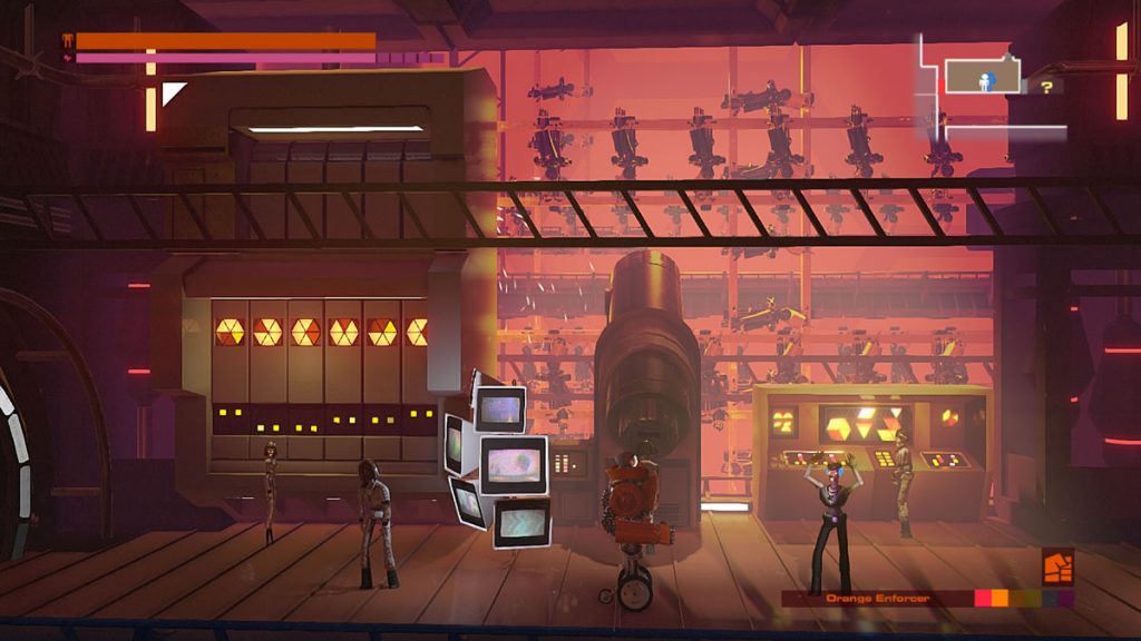 Um detalhe: não há pulos em Headlander. Você pode voar com a sua cabeça por plataformas, mas robôs não possuem a habilidade de pular. Você pode pensar que isso não é um problema, mas as vezes é justamente esse o desafio de certas áreas. Encontrar meios de acessar algumas pontos levando um corpo robótico consigo, pois apenas voar com a sua cabeça até uma porta não permite abri-las.