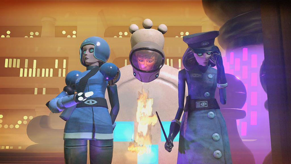 Mas o maior mérito mesmo de Headlander é sua direção de arte. O game se passa em um futuro distópico, em algum lugar do espaço, na qual o jogador acorda descobrindo que é uma simples cabeça voadora, sem um corpo e sem cordas vocais – o que lhe impede de falar. Esse futuro de muitos elementos de ficção científica segue uma temática estilosa, brincando com aquela atmosfera da contracultura e do movimento hippie dos anos 60/70, com robôs trajando roupas da época, com diálogos característicos da cultura paz e amor, só que nos panos de fundo há alguma entidade controlando e alienando (ainda mais) essa sociedade robótica. Simplesmente genial.