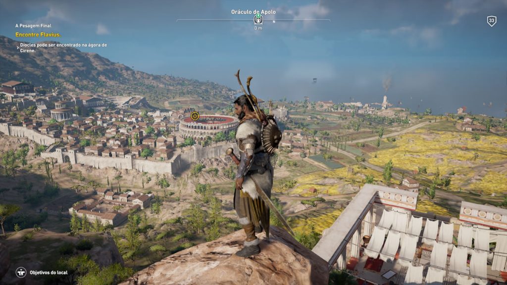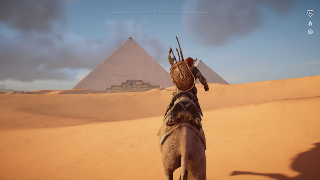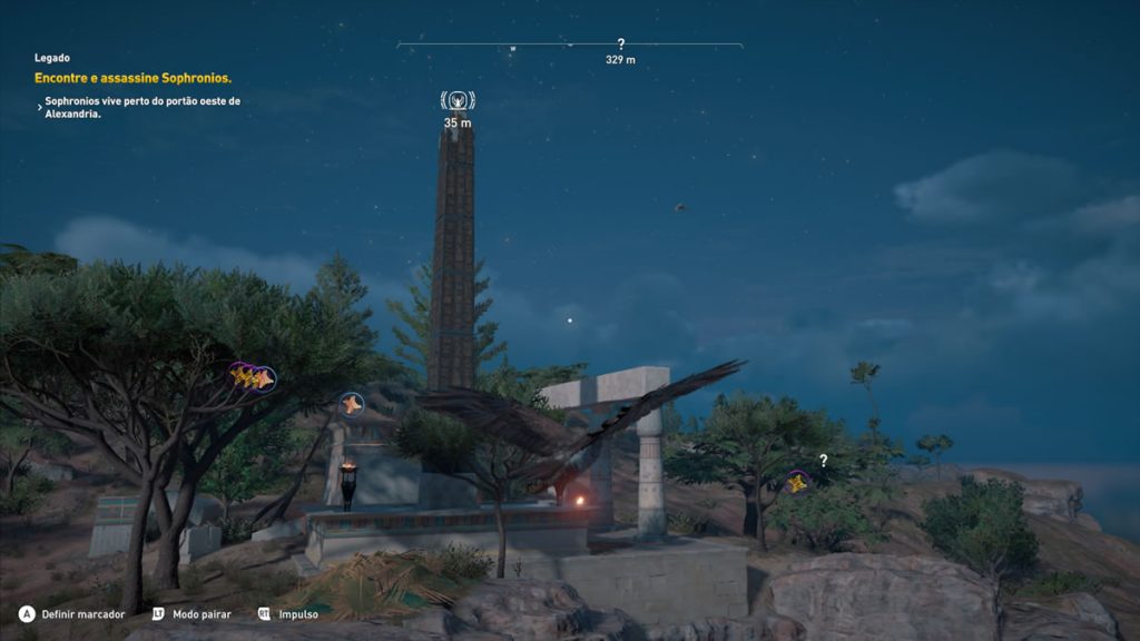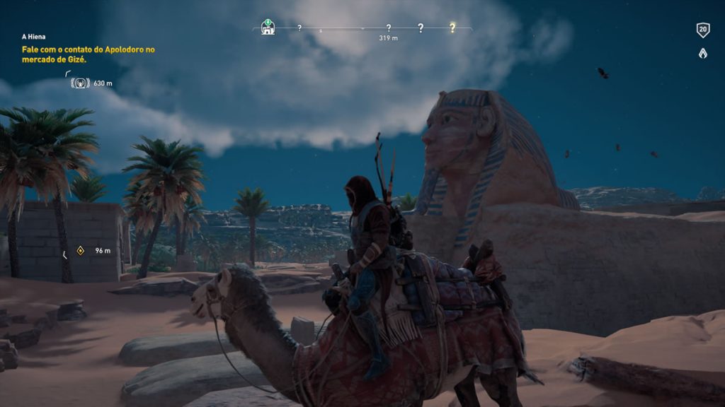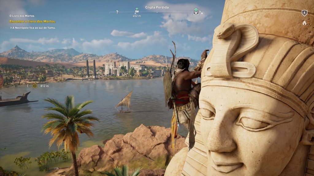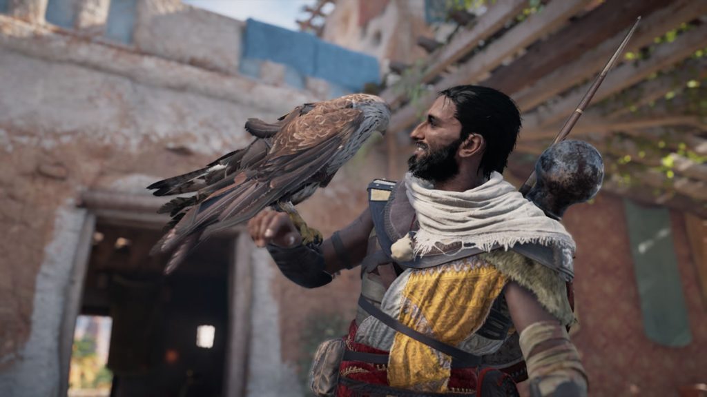 Alias, já ia me esquecendo, a águia adicionada no game é um recurso de mecânica excepcionalmente genial. É como um drone, só que muito melhor. Com um comando o jogador coloca uma águia no céu que identifica inimigos, tesouros, alvos etc. E tudo em tempo real, sem carregar telas ou ter que esperando longos segundos, sem amarras de distância de onde Bayek se encontra. Podendo inclusive “pausar” a águia no ar para uma boa visualização da área desejada.