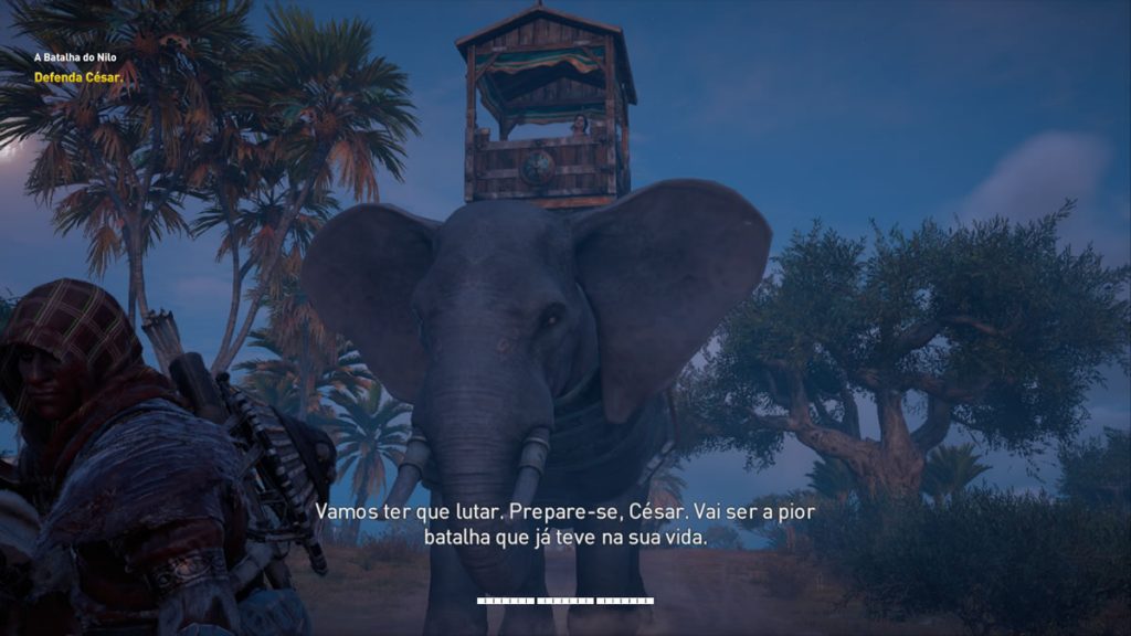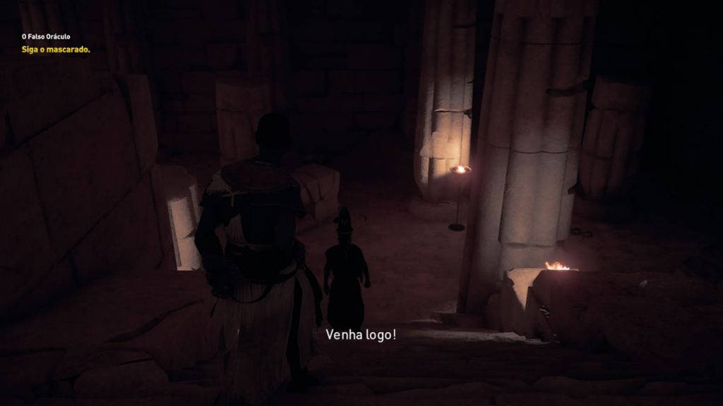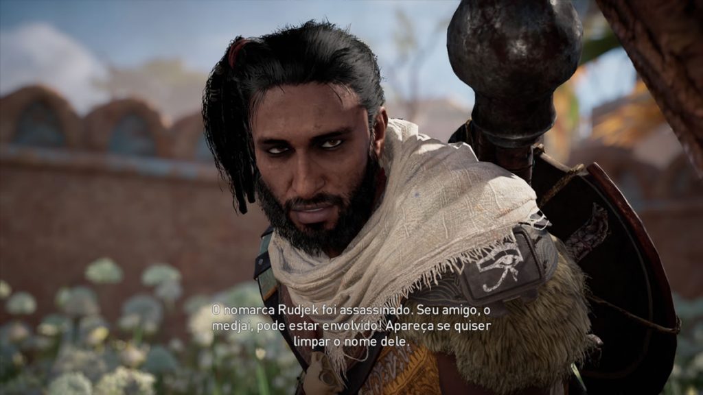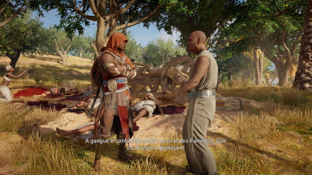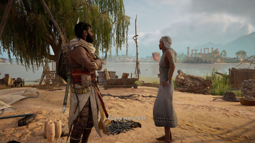 Há a questão de dublagem em português, que me incomodou muito nas primeiras horas do jogo, no sentido que muitas vezes o tom da voz aparenta não casar com o aspecto físico dos personagens, como mulheres idosas que soam como jovens ou personagens masculinos magrelos que possuem um timbre de voz muito grossa. Mas sinceramente, depois de horas e horas nesse universo, esqueci completamente de que a dublagem estava me incomodando. Bayek e Aya por sinal possuem vozes que condizem com suas personalidades. E para ser honesto, coloquei o game em inglês no começo e notei que as mesmas vozes que me incomodaram em português também soavam estranhas em inglês. É algo que assusta sim inicialmente, mas depois de imerso no universo do jogo acaba passando despercebido.