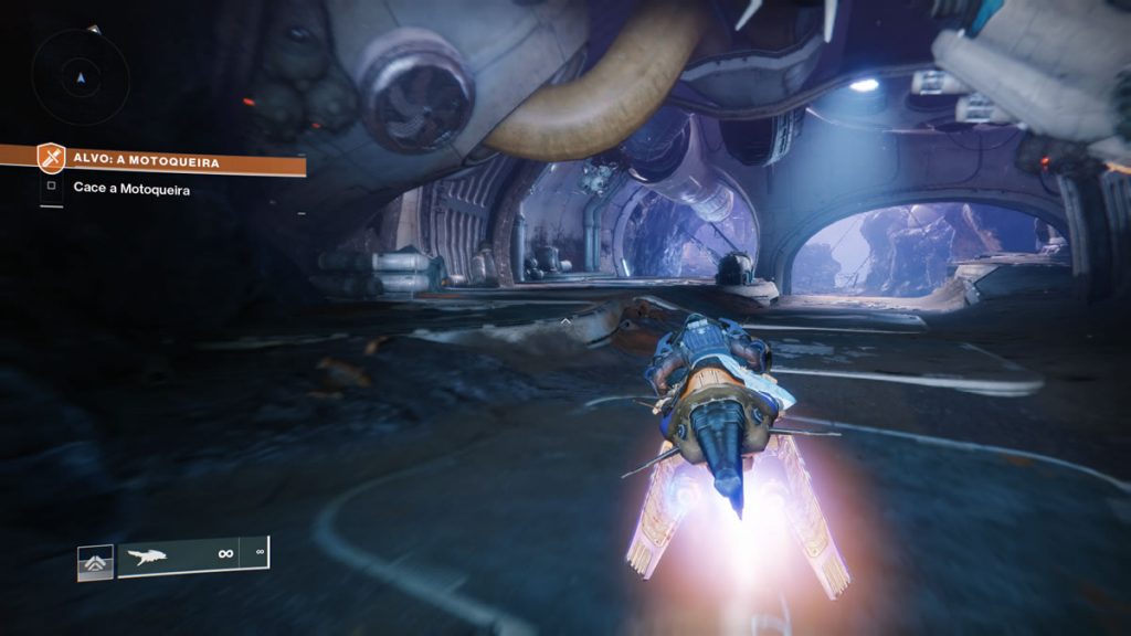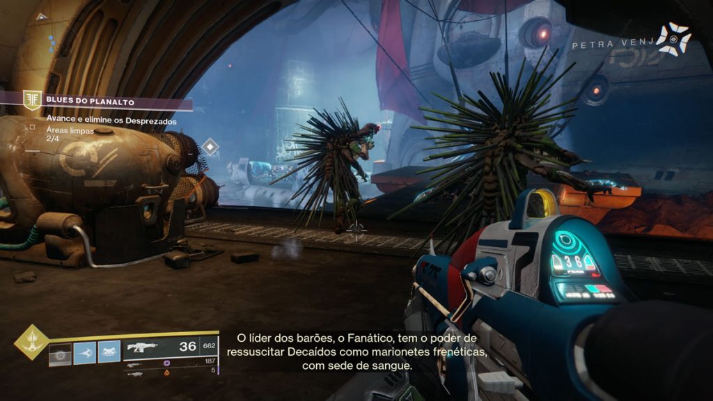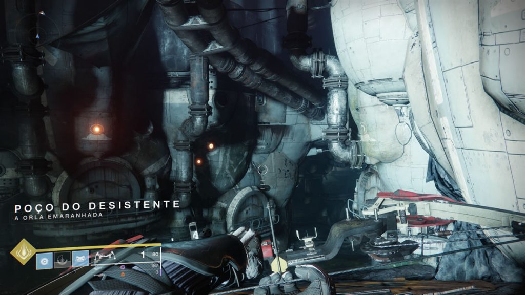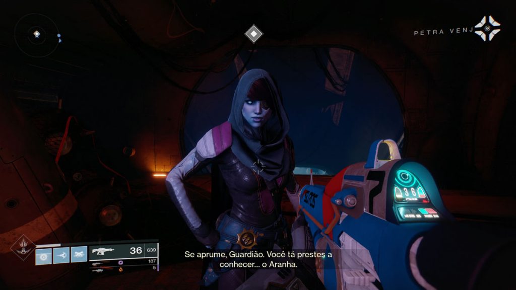 Gosto em particular de um dos novos personagens que toma conta dessa área: o Aranha. Primeiro que a voz desse personagem ganhou uma excelente versão dublada em nosso português. Posso estar enganado, mas ele é dublado pelo Eduardo Borgerth, que é responsável pela voz do Ciborgue em Os Jovens Titãs. O Aranha acaba soando como um Ciborgue do Mal, meio daqueles bandidos malandros, mas estrategistas. Ficou animal. Adorei mesmo tal personagem. Tem boas linhas de diálogos e um papel importante na trama. Não substitui a perda de Cayde-6 no segmento de boas falas e humor sagaz, mas certamente é uma boa adição ao elenco atual do jogo.