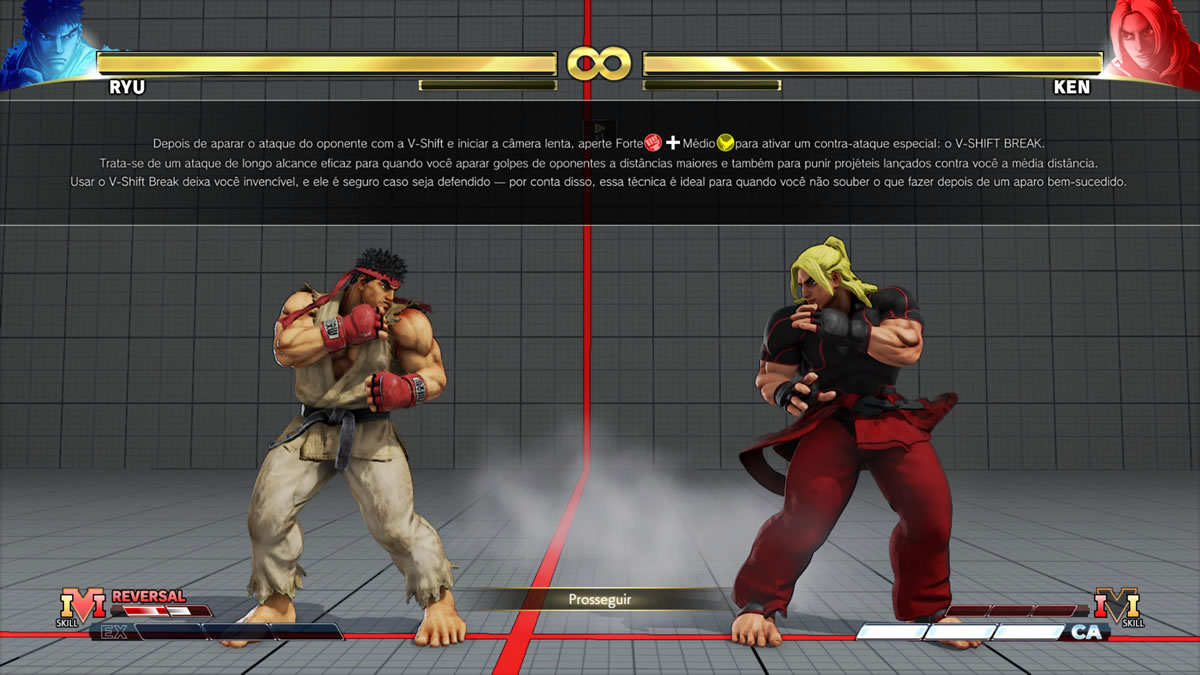 O bacana é que o jogo possui um bom modo para ensinar o jogador a se especializar nos personagens a qual mais curtir. O modo de treino é bem completo, indo dos movimentos básicos aos meus profissionais. Ensinando golpes, combos, conectando ambos, além dos movimentos que a V-Gauge permite para cada personagem. Não é fácil de se tornar mestre de um personagem. É preciso insistir bastante, mas eventualmente os mais esforçados vão aprender muito além do básico. E outra coisa, se não estiver fácil fazer apenas com o roteiro dos comandos em tela, é possível ver vídeos dos movimentos, afim de entender melhor o momento em que se conecta cada golpe ensinado.