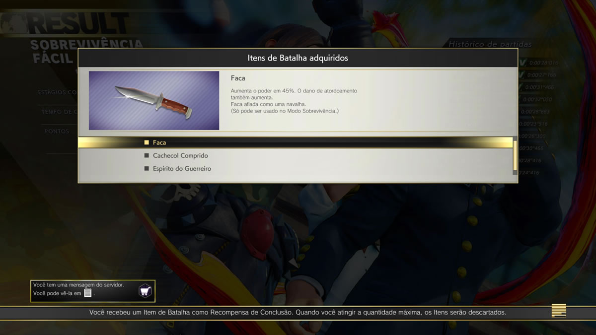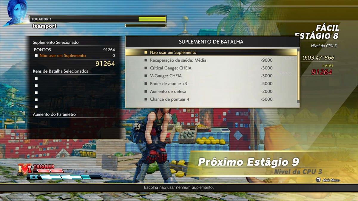 Um outro modo que me chamou atenção é baseado em missões por tempo limitado, challenges no original, em que o jogador gasta o dinheiro virtual do jogo para poder participar de uma luta. Se sair vitorioso, pode ganhar diversas recompensas, desde itens para se usar no citado modo sobrevivência, até skins para personagens ou títulos para equipar no seu perfil online. Porém se perder, é preciso pagar de novo para uma nova tentativa. Interessante… contudo sou meio mão de vaca e fico com receio de ficar torrando meu dinheiro virtual (que se ganha jogando diversos modos e cumprindo pequenas metas diárias, como executar golpes ou jogar online). As missões tem diversos níveis de dificuldade, das mais fáceis, as mais cabeludas.