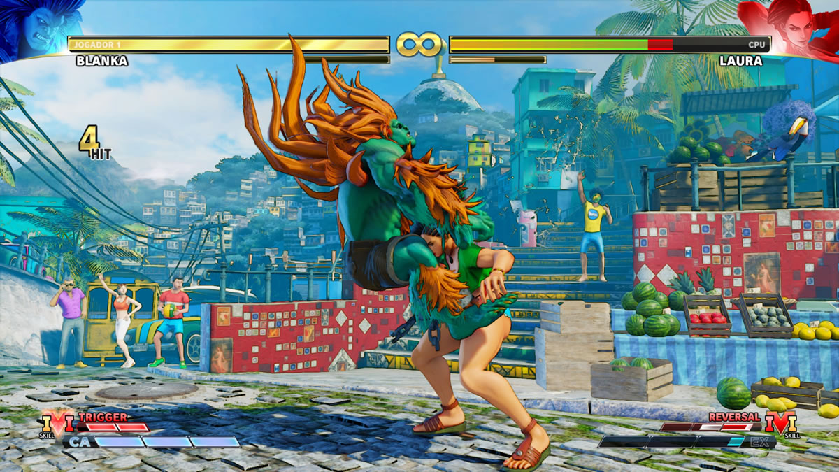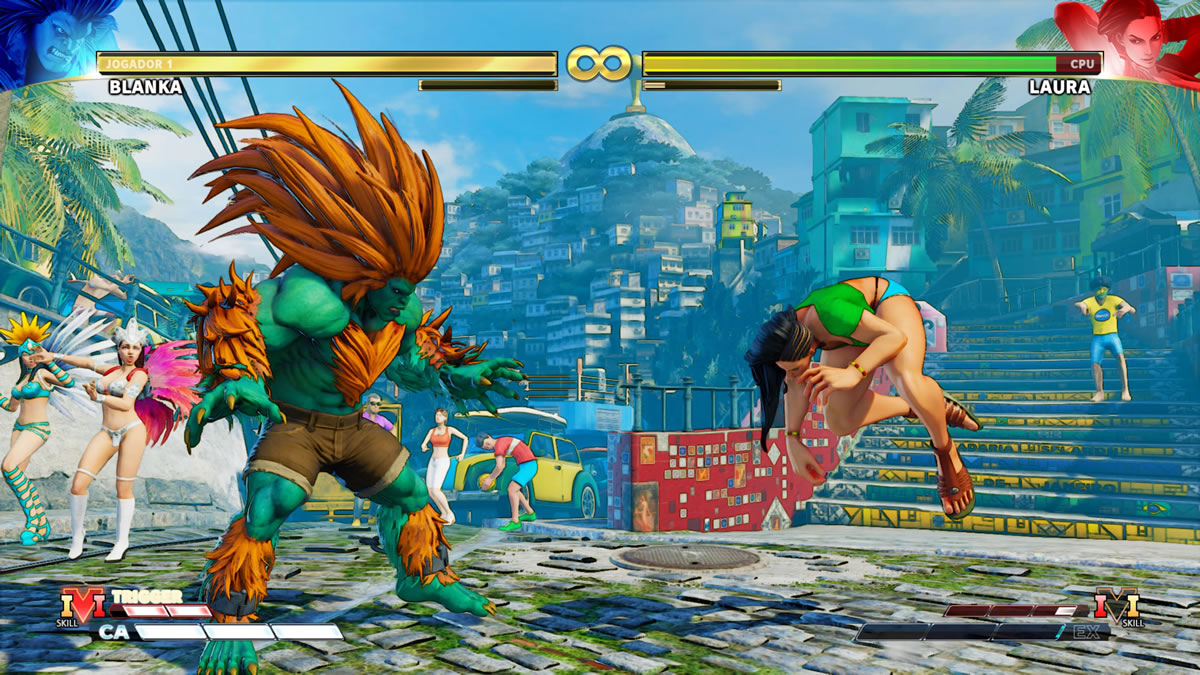 A animação dos personagens, assim como transição entre golpes e seus movimentos também fui muito bem, se bem que ainda tenho uma ligeira impressão de que em SFIV os personagens fossem um pouquinho mais ágeis no geral, fosse para levantar, pular ou avançar sobre o adversário. Alguns personagens de SFV dão uma impressão de serem mais pesados e lentos, mas aí pode ser apenas um melhor balanceamento dentro do elenco, para soar mais coerente as vantagens e desvantagens das técnicas e tamanho de cada personagem.