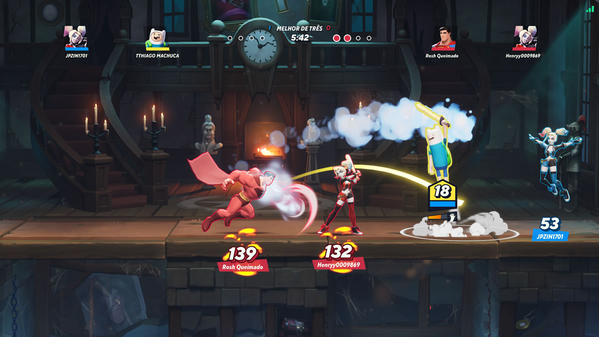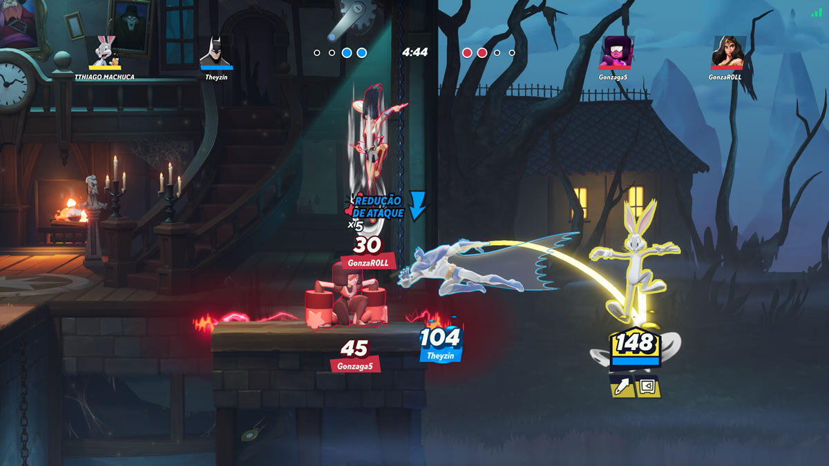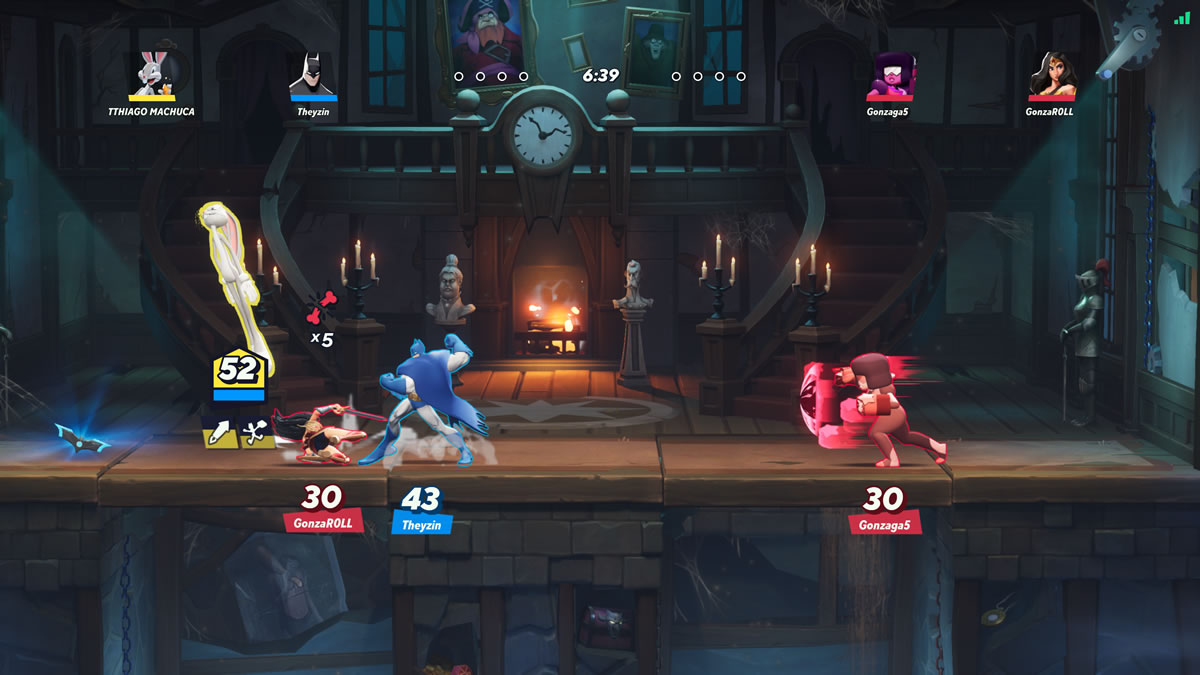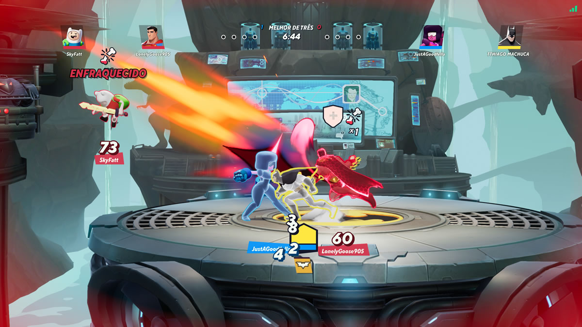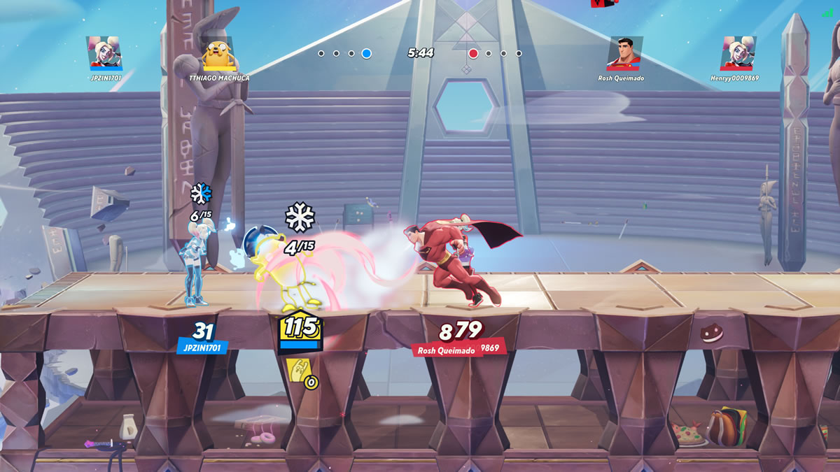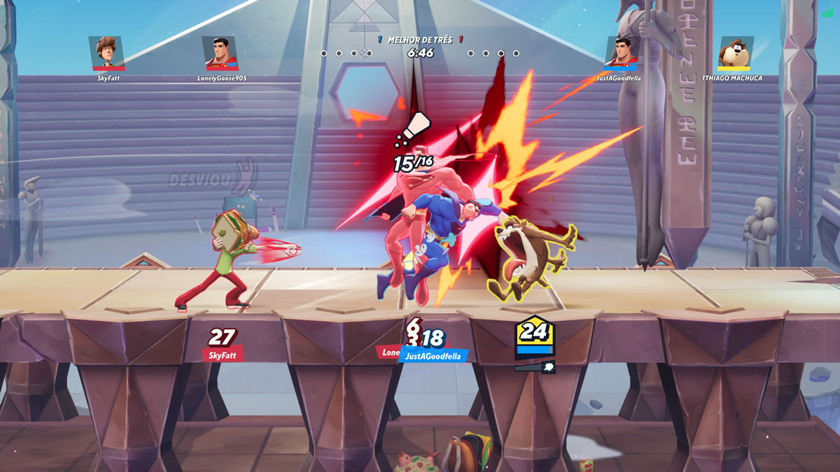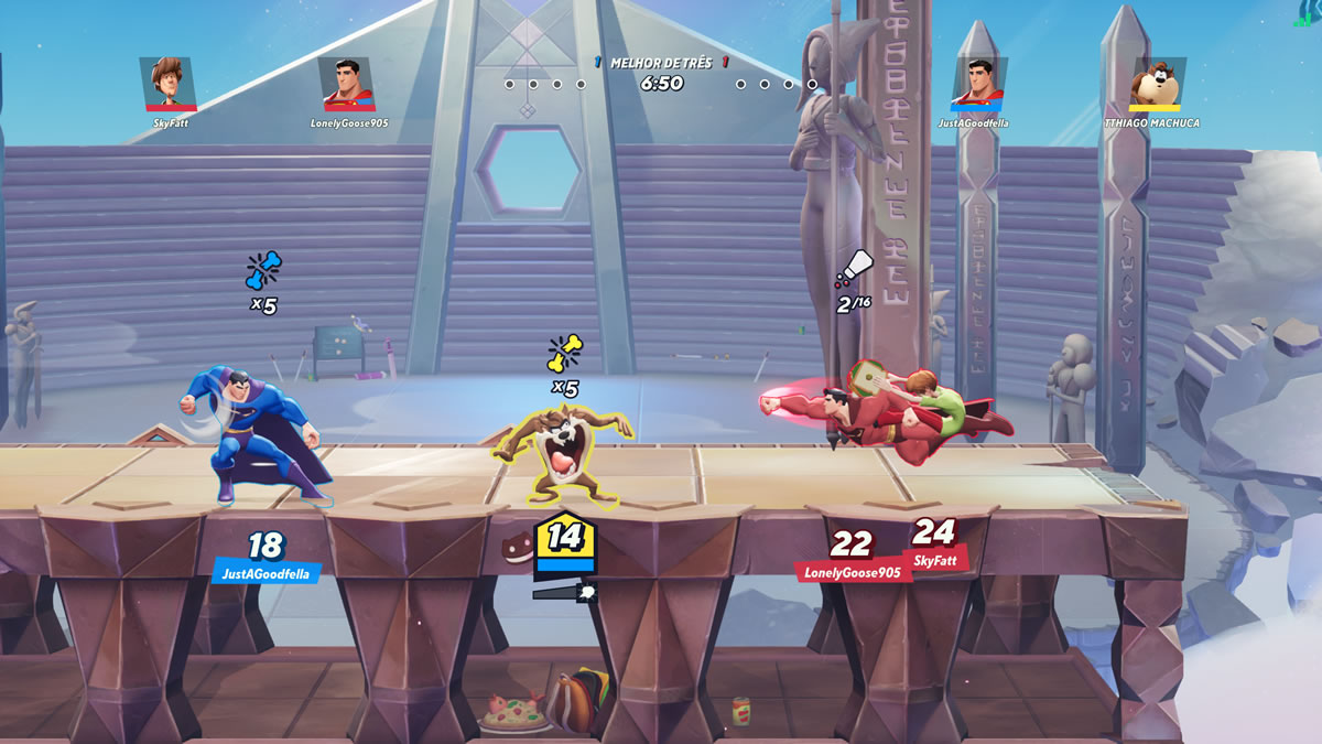 Posso exemplificar esse argumento quando penso em certos movimentos que estão em diversos personagens, como o Batman, Mulher-Maravilha e até mesmo no Reindog, único personagem original criado para o elenco até o momento. Estes personagens possuem movimentos que podem laçar outros jogadores, aliados ou adversários, trazendo para juntos de si, servindo tanto para forçar a aproximação de um oponente, ou para salvar um aliado que está fora da arena, prestes a sair do cenário. E esse tipo de tática é muito utilizado nos combates de MultiVersus, e não é muito comum em Smash Bros.