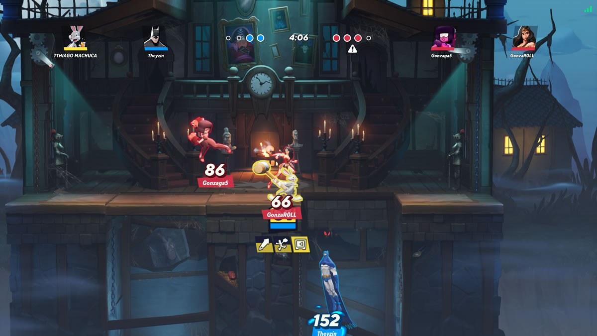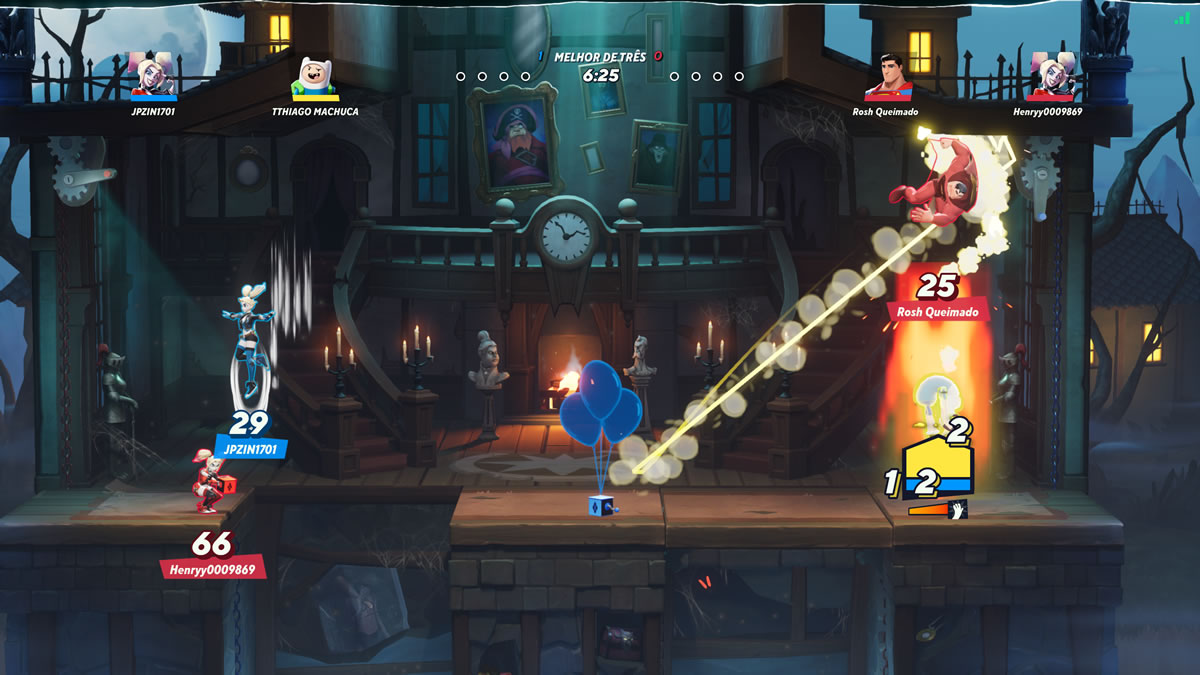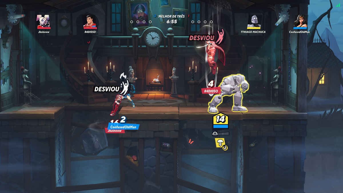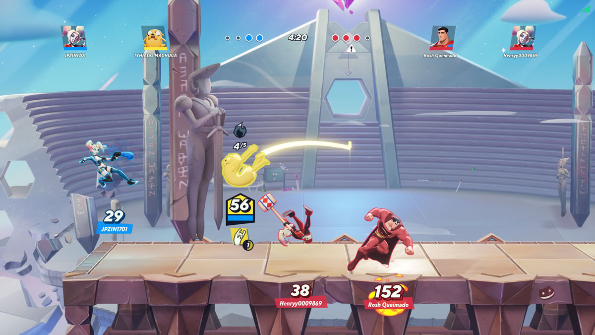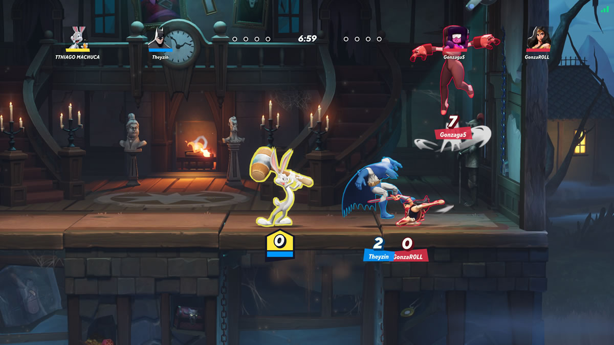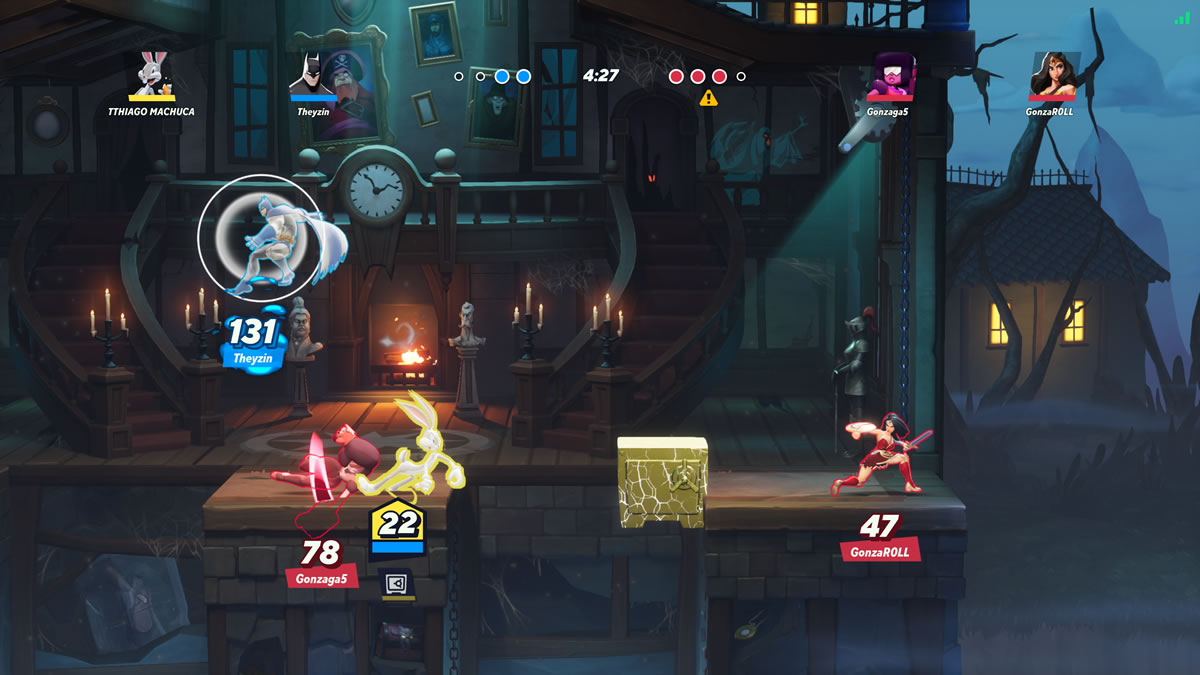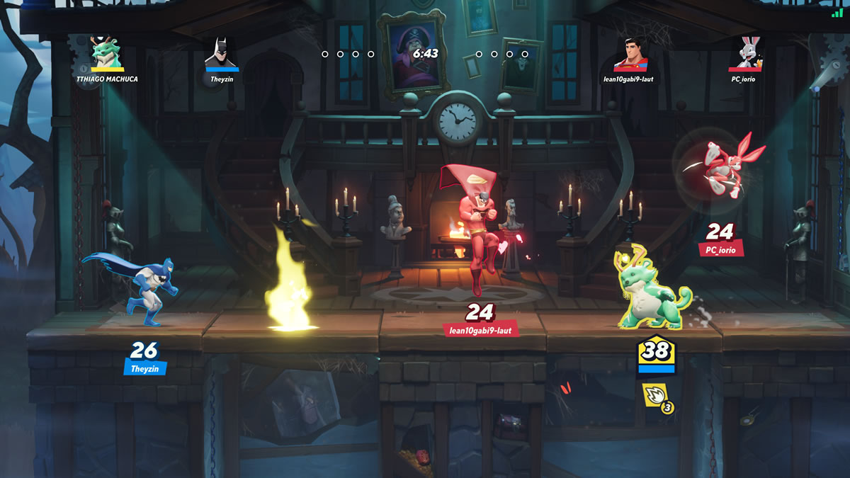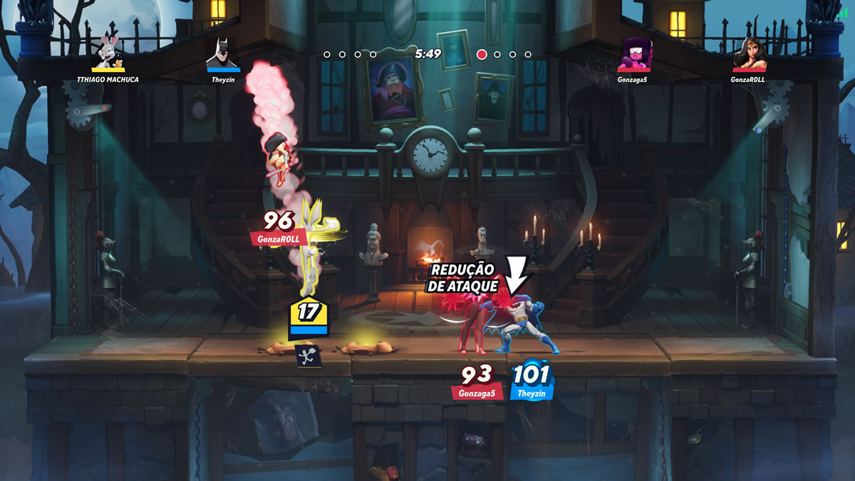 Posso exemplificar esse argumento quando penso em certos movimentos que estão em diversos personagens, como o Batman, Mulher-Maravilha e até mesmo no Reindog, único personagem original criado para o elenco até o momento. Estes personagens possuem movimentos que podem laçar outros jogadores, aliados ou adversários, trazendo para juntos de si, servindo tanto para forçar a aproximação de um oponente, ou para salvar um aliado que está fora da arena, prestes a sair do cenário. E esse tipo de tática é muito utilizado nos combates de MultiVersus, e não é muito comum em Smash Bros.