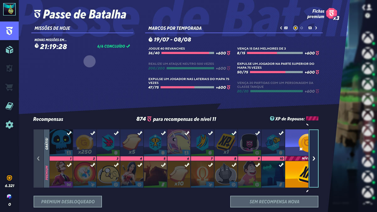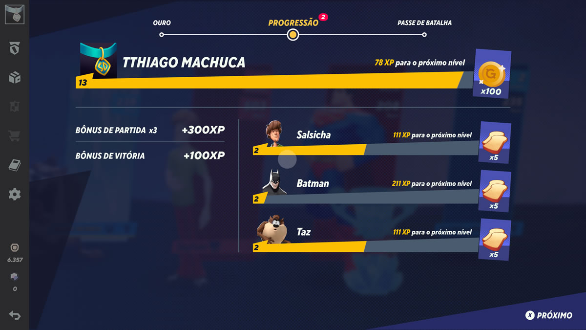 O ponto é que pouca se faz com moedas douradas nesse momento em MultiVersus, além de ser utilizada para destravar personagens. Há alguns treinos de perks que custam algumas moedas (é baratinho), mas todo o resto cosmético do jogo, desde saídas estilosas da arenas, papel de parede e insígnias de perfil, vozes de narração com os personagens, além de emotes… tudo isso é adquirido com Gleanium.