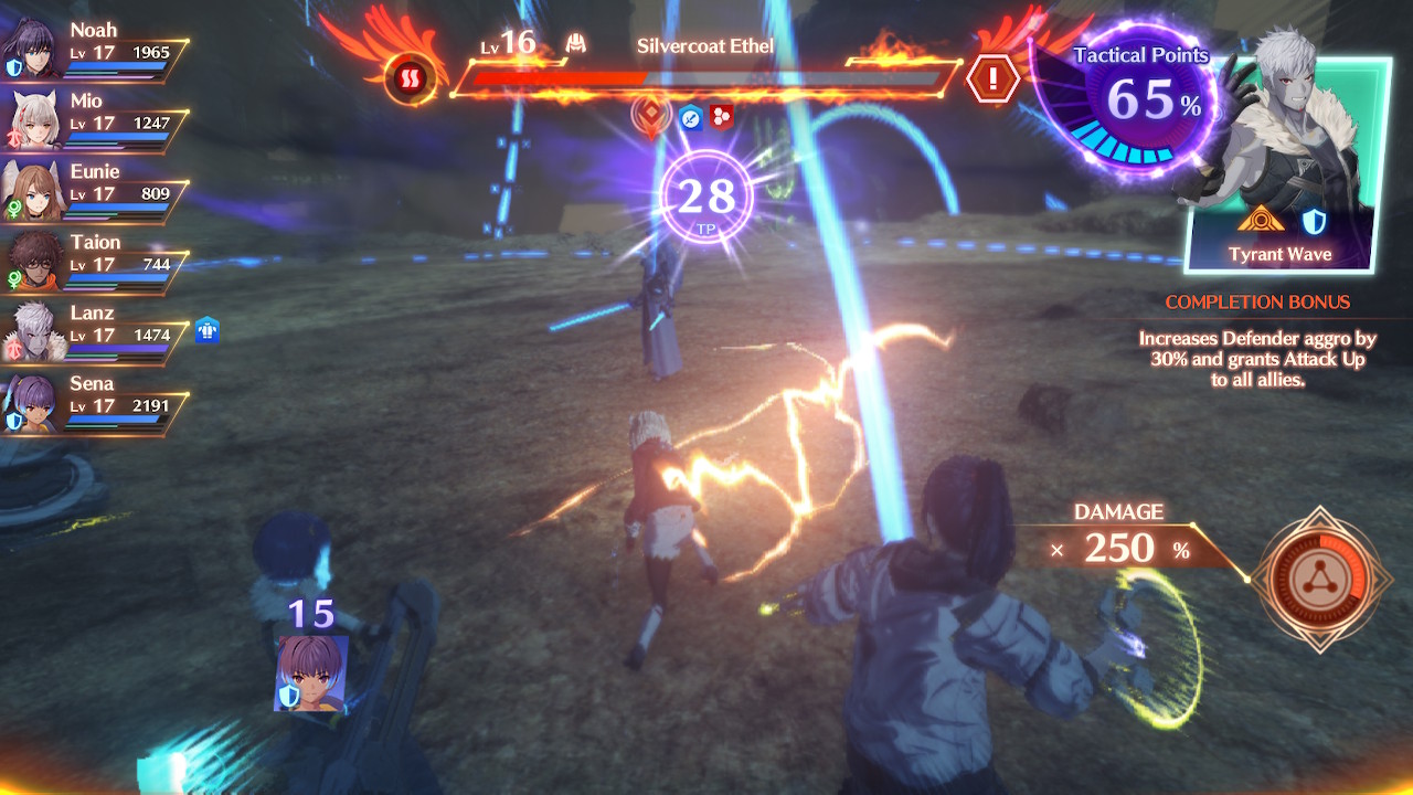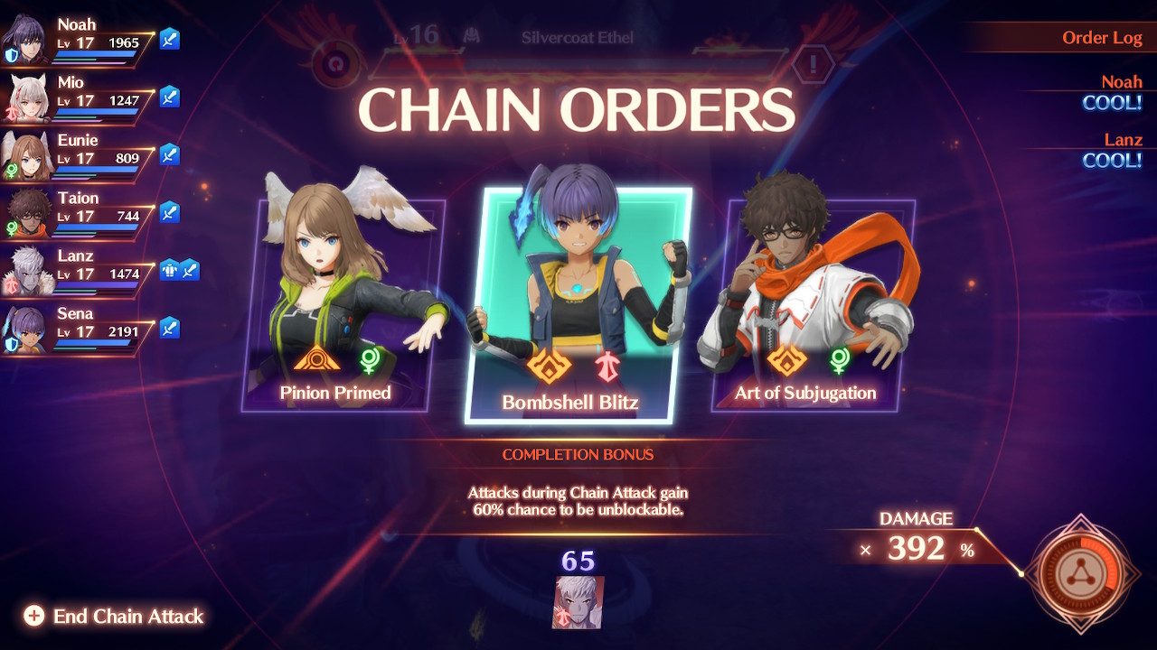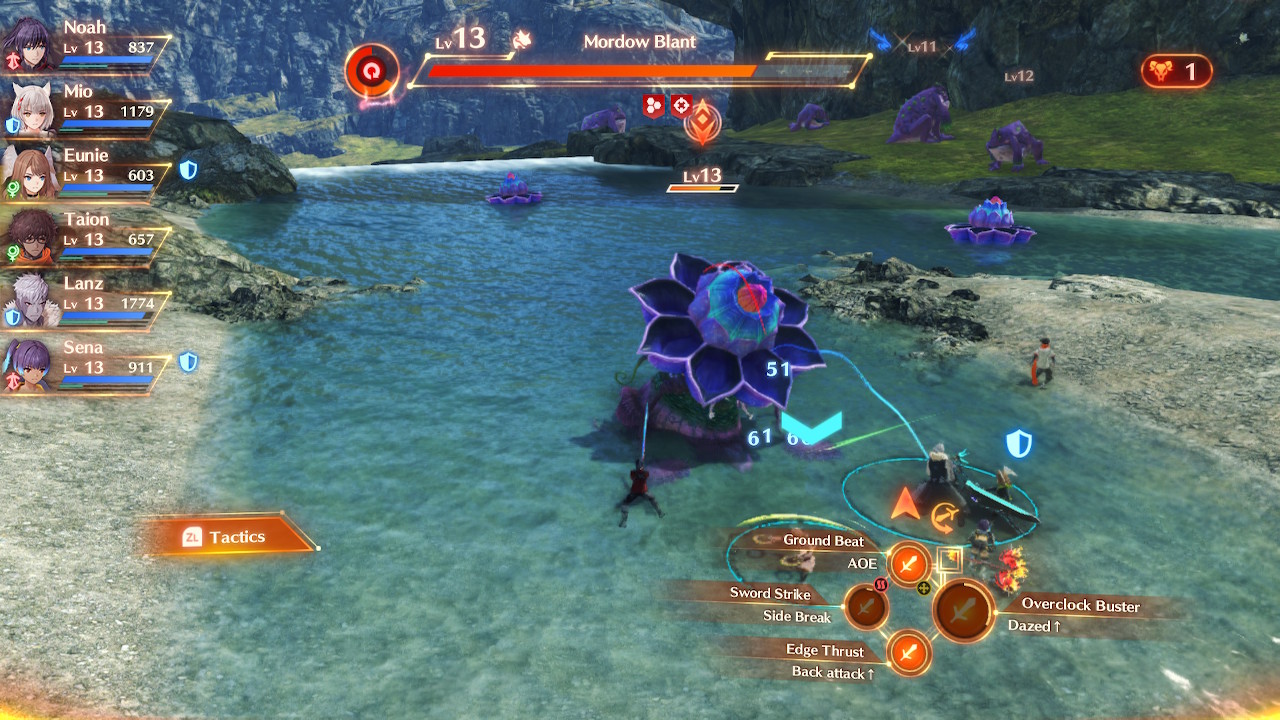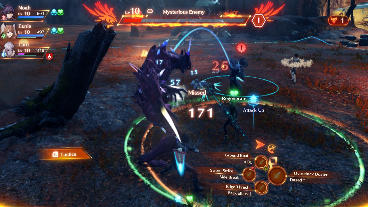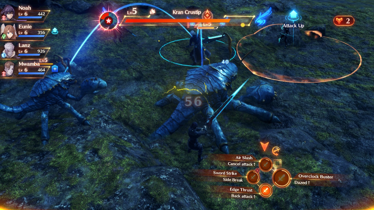 Mas não é só isso. Além da efetividade quanto a posição de onde atacar, há um sistema de quebra de defesa do inimigo, que o deixa em um estado de atordoamento, denominado Burst Combo. Basicamente isso ocorre quando os personagens utilizam ataques coordenados que são classificados como break, topple e daze (quebrar, derrubar e atordoar). Cada personagem possui somente uma Art com esse elemento. Por exemplo, Noah tem um golpe especial que ativa o break se atacar na lateral do inimigo. Lanz em seguida utiliza um ataque frontal que causa topple, e por último Eunie aplica um golpe com daze. Inimigo atordoado, hora de sentar-lha a porrada que todos os golpes ficam com dano maximizado.