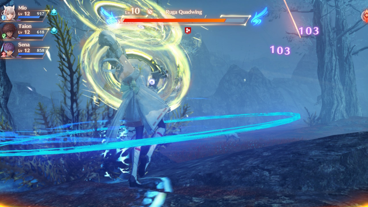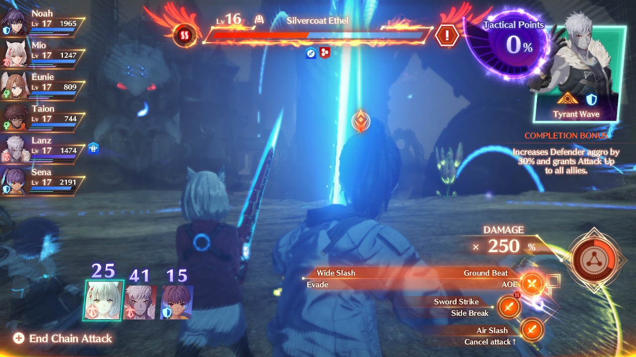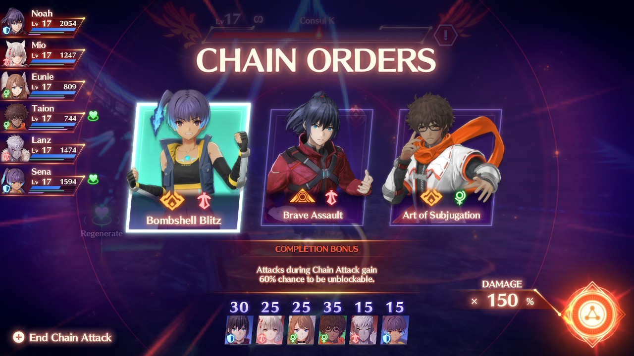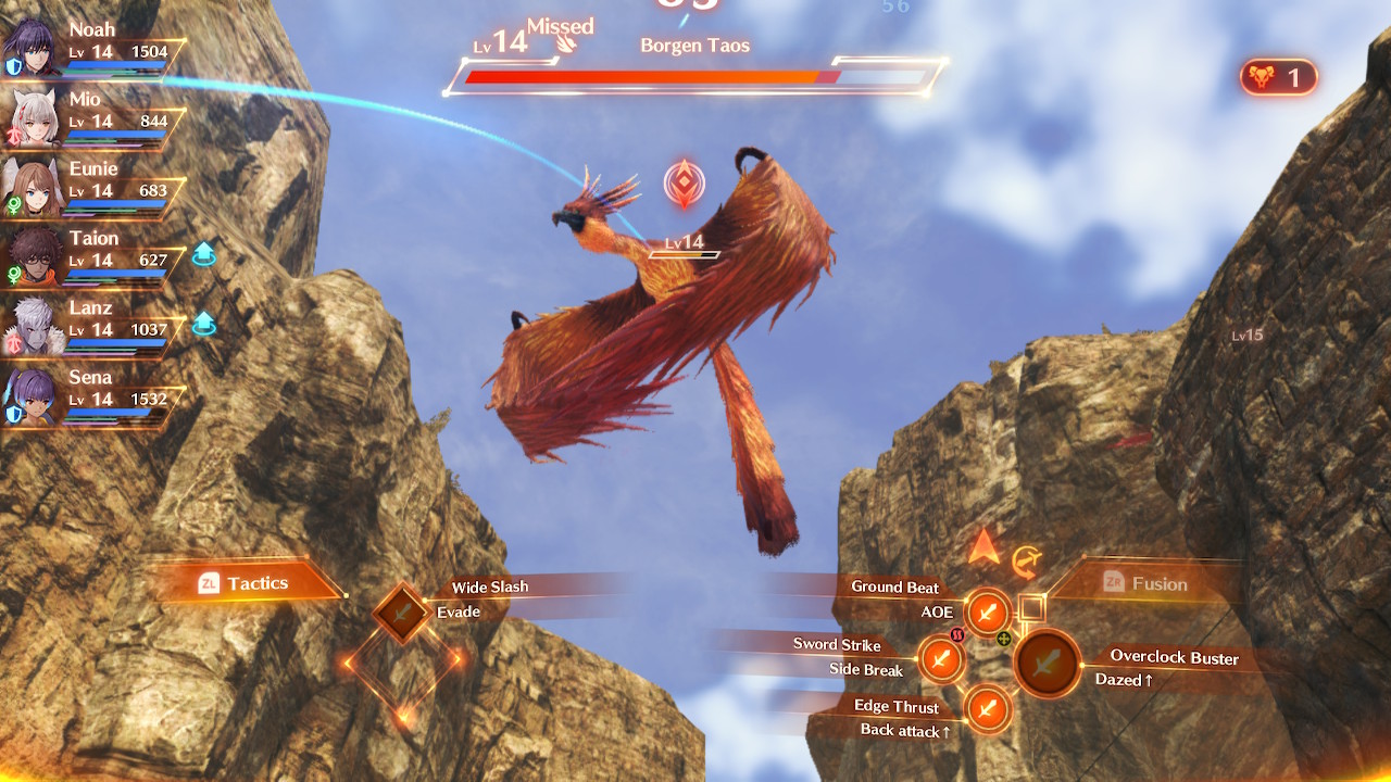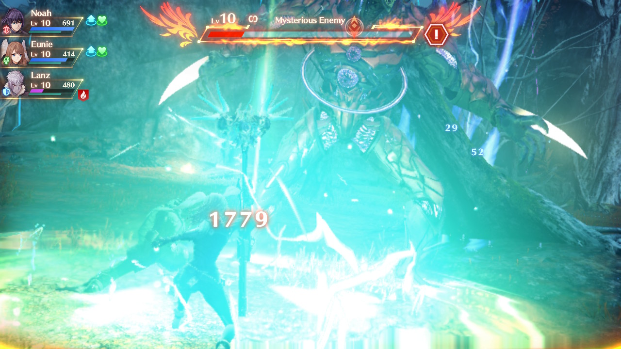 Mas não é só isso. Além da efetividade quanto a posição de onde atacar, há um sistema de quebra de defesa do inimigo, que o deixa em um estado de atordoamento, denominado Burst Combo. Basicamente isso ocorre quando os personagens utilizam ataques coordenados que são classificados como break, topple e daze (quebrar, derrubar e atordoar). Cada personagem possui somente uma Art com esse elemento. Por exemplo, Noah tem um golpe especial que ativa o break se atacar na lateral do inimigo. Lanz em seguida utiliza um ataque frontal que causa topple, e por último Eunie aplica um golpe com daze. Inimigo atordoado, hora de sentar-lha a porrada que todos os golpes ficam com dano maximizado.
