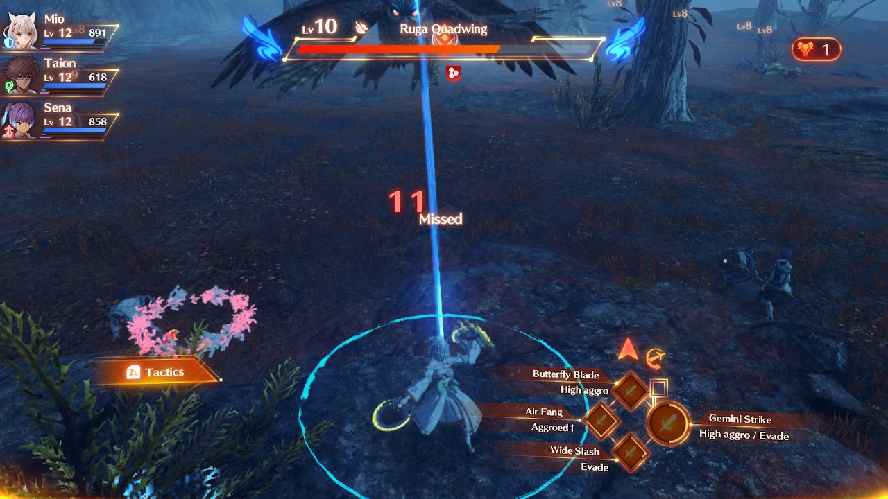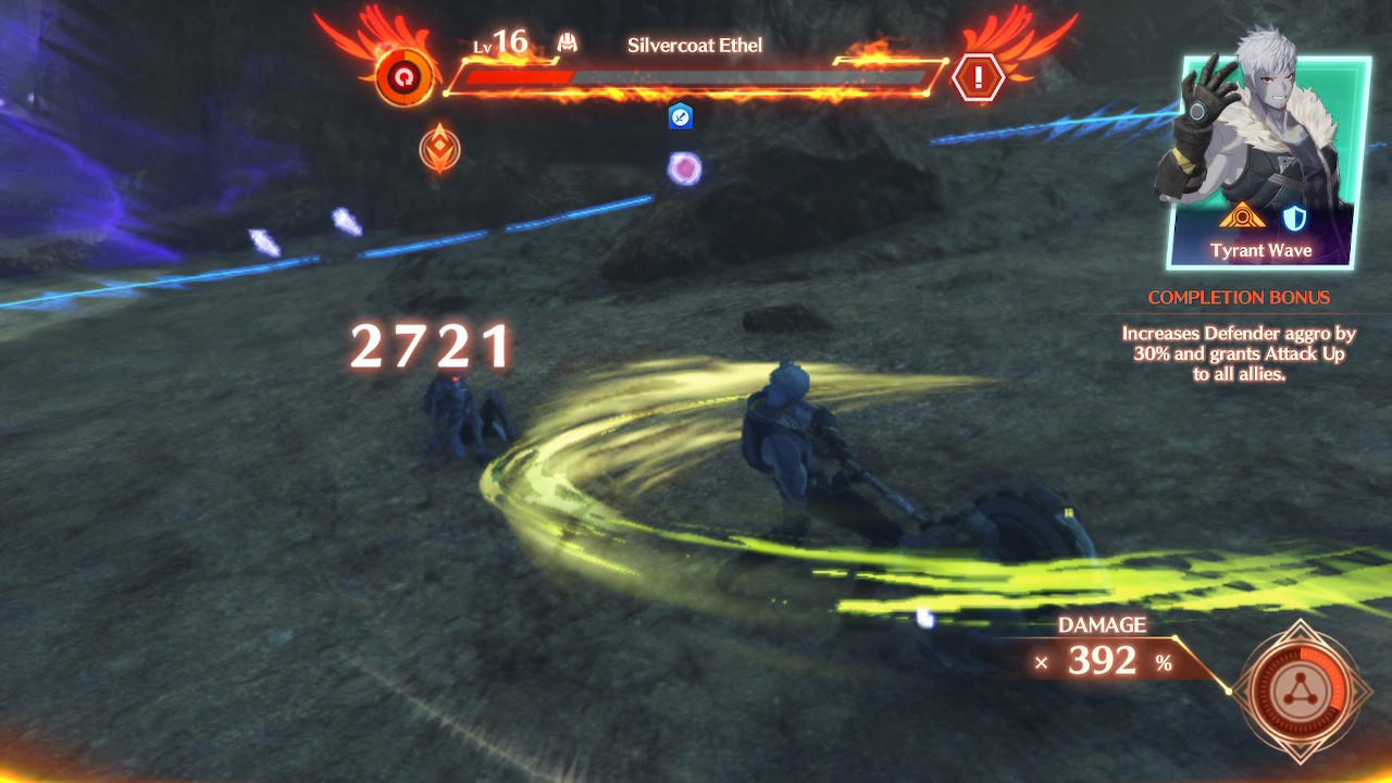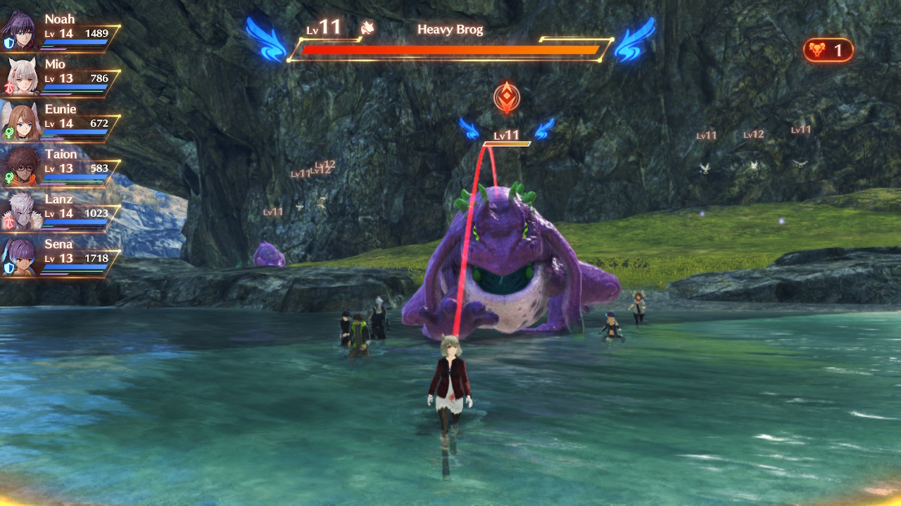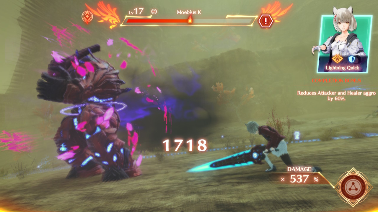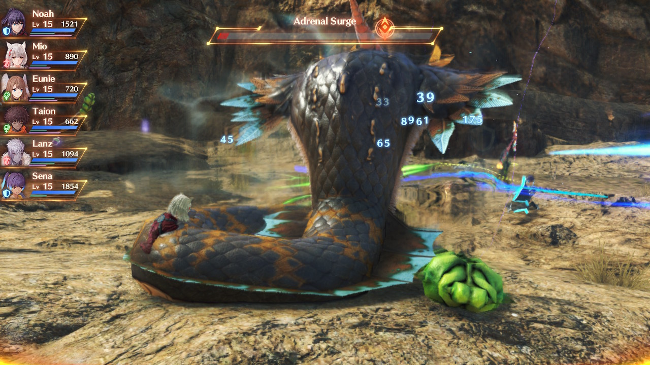 Mas não é só isso. Além da efetividade quanto a posição de onde atacar, há um sistema de quebra de defesa do inimigo, que o deixa em um estado de atordoamento, denominado Burst Combo. Basicamente isso ocorre quando os personagens utilizam ataques coordenados que são classificados como break, topple e daze (quebrar, derrubar e atordoar). Cada personagem possui somente uma Art com esse elemento. Por exemplo, Noah tem um golpe especial que ativa o break se atacar na lateral do inimigo. Lanz em seguida utiliza um ataque frontal que causa topple, e por último Eunie aplica um golpe com daze. Inimigo atordoado, hora de sentar-lha a porrada que todos os golpes ficam com dano maximizado.