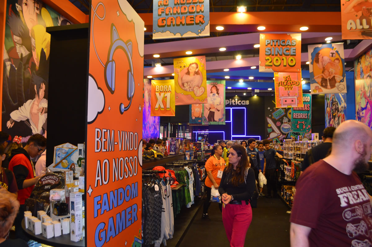 Também havia um estande muito bem posicionado no evento da marca Piticas, e é uma empresa que tem como seu principal produto camisetas, contudo, boa parte dos produtos levados ao evento eram de marcas de animês, como Naruto e One Piece. Também havia todo um setor dedicado a Harry Potter. Veja bem, não acho ruim que tudo isso esteja no evento, mas novamente, lá estava eu, procurando camisas e produtos relacionados a videogames! Camisas de animês ou de Harry Potter, a gente encontra com facilidade em qualquer lugar, oficial ou não, convenhamos.