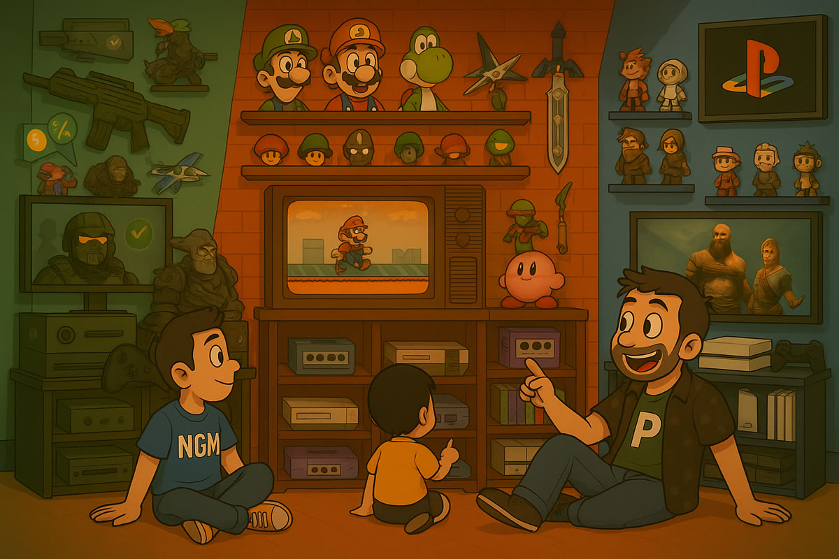 Então veio a ideia de mais de um alter ego, em diferentes faixas etárias. Então surge o personagem mais jovem, cabelo de topete, camisa azul e com as letras “NGM“, uma representação pessoal anterior ao Portallos, porque tudo isso começou em um fórum, que por muitos anos era conhecido como Fórum NGM (“Nós, Games, Merecemos”), e a primeira versão desse fórum era azul, daí a camisa de tal cor. Logo descobri que me senti confortável chamando-o de Mac, só uma abreviação do meu sobrenome, já que na adolescência muitos me chamavam apenas pelo sobrenome.