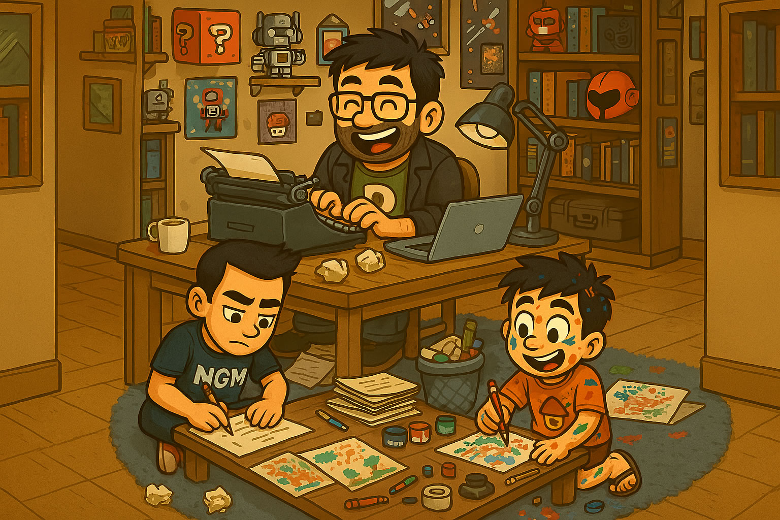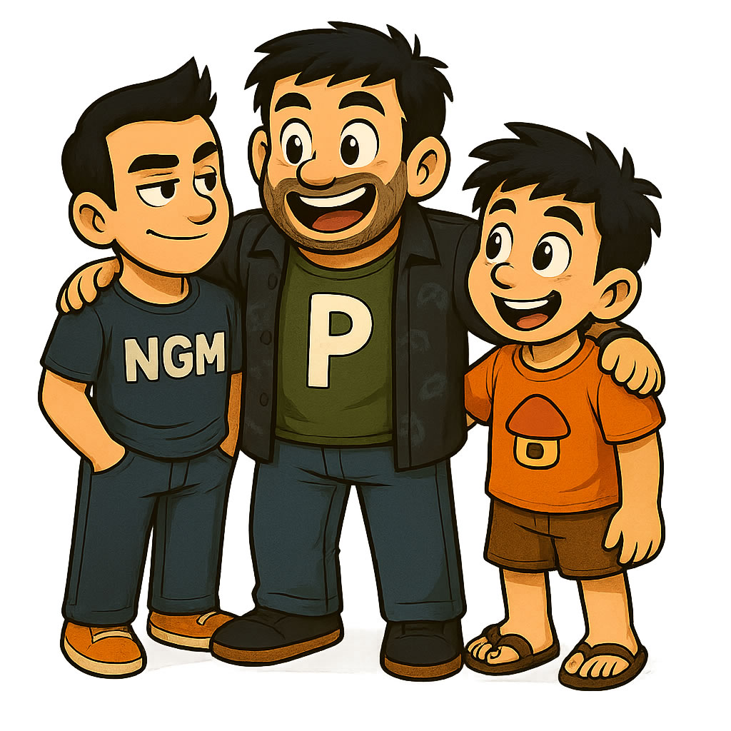 Utilizando o ChatGPT expandi o cenário, mantendo a inspiração do traço do antigo desenho, e fui trocando os aranhas pelos personagens criados, alter egos em idade diferentes, apontando entre si. Foi a primeira arte conceitual do Edd, Mac e Guri. Repare que nessa versão eles ainda estão com o cabelo marrom, porque o cabelo escuro só veio posteriormente, quando entendi como pedir ao ChatGPT para criar tons de preto natural para os cabelos dos personagens.