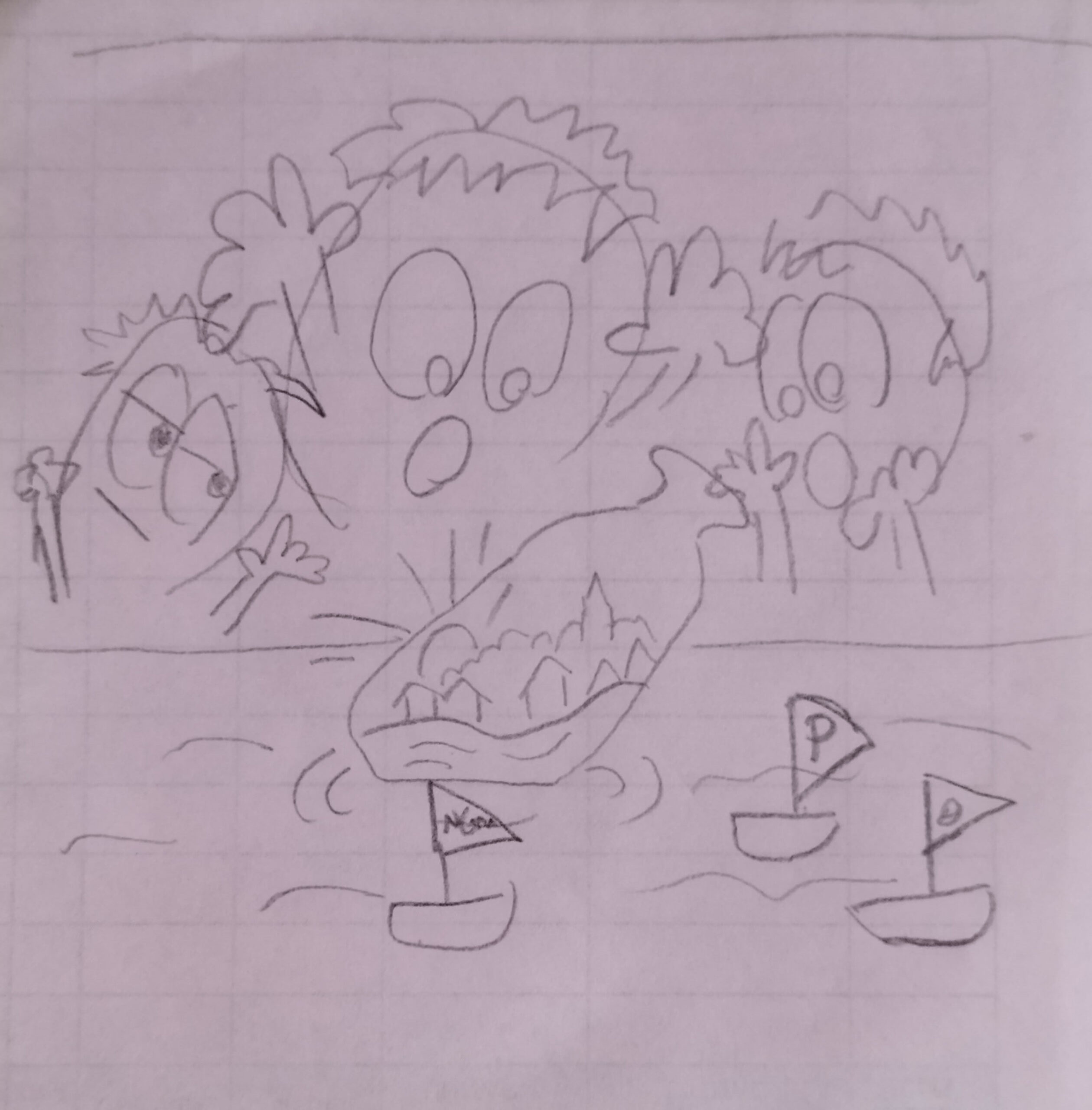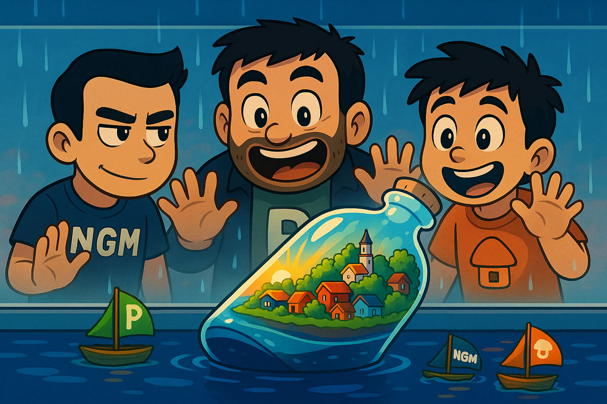 Um exemplo é essa arte dos personagens observando a garrafa. Os barquinhos da arte forma inseridos manualmente, pois em uma das artes teste para chegar ao resultado final, o ChatGPT fez estes embarcações de uma forma excepcionalmente bem, e então fiz o recorte e inseri eles manualmente na arte que mais gostei para finalizar o conceito. Ou seja, nem sempre o ChatGPT me entrega tudo pronto de bandeja, mesmo com esboço e longos prompts roteirizando a ideia.