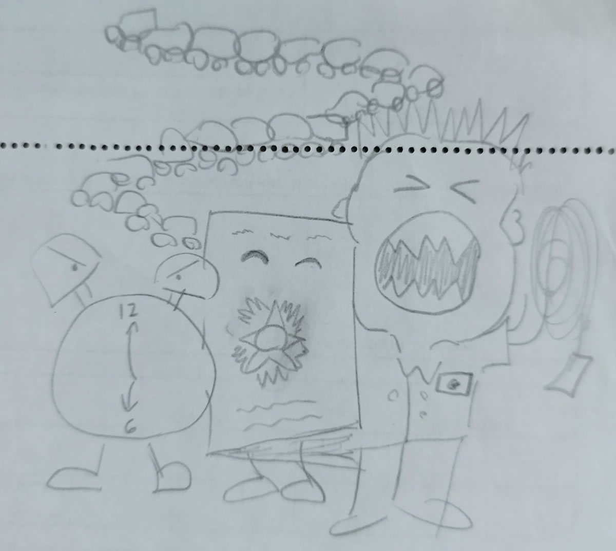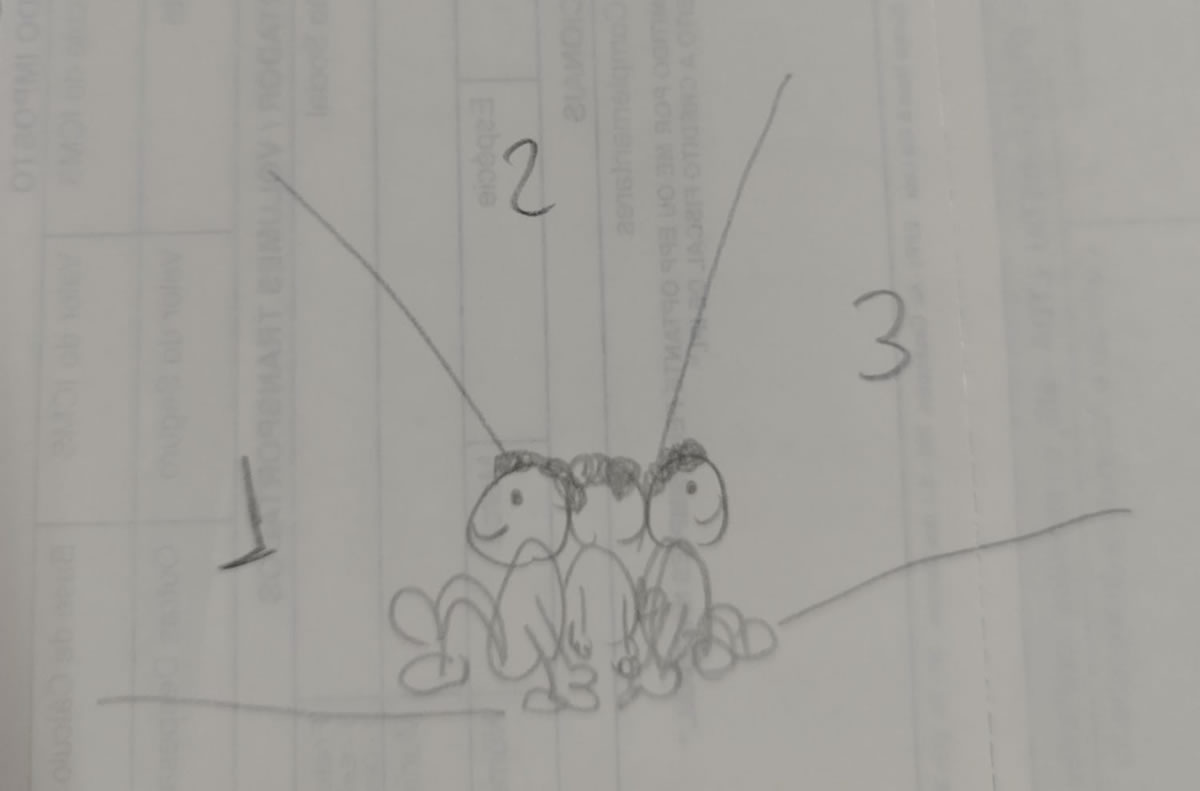 Utilizando o ChatGPT expandi o cenário, mantendo a inspiração do traço do antigo desenho, e fui trocando os aranhas pelos personagens criados, alter egos em idade diferentes, apontando entre si. Foi a primeira arte conceitual do Edd, Mac e Guri. Repare que nessa versão eles ainda estão com o cabelo marrom, porque o cabelo escuro só veio posteriormente, quando entendi como pedir ao ChatGPT para criar tons de preto natural para os cabelos dos personagens.