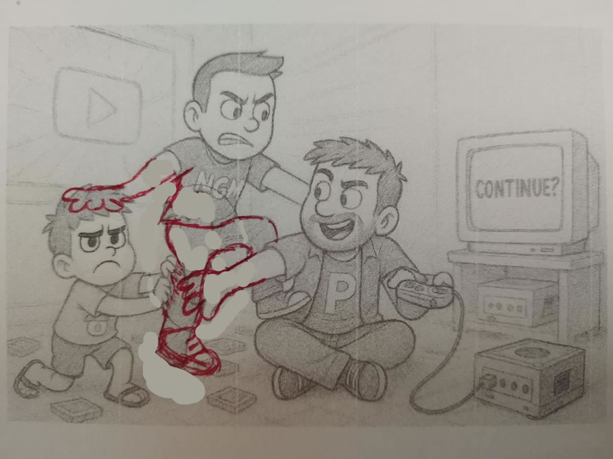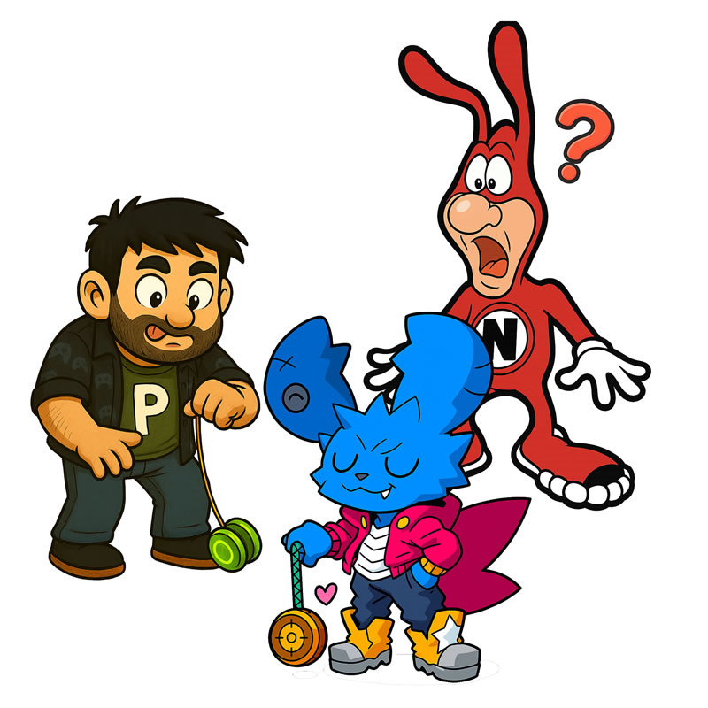 Só que não fiquei satisfeito com essa ideia de trabalhar com um único personagem representando o site. Porque o Portallos tem uma história, tem uma trajetória, passou por fases e mudanças. E o Edd é o que o site (e eu) somos hoje. Mas e quem fui no passado? Bem, é aí que entra os outros dois personagens, o jovem com a camisa da NGM e o menino com a camisa de cogumelo.