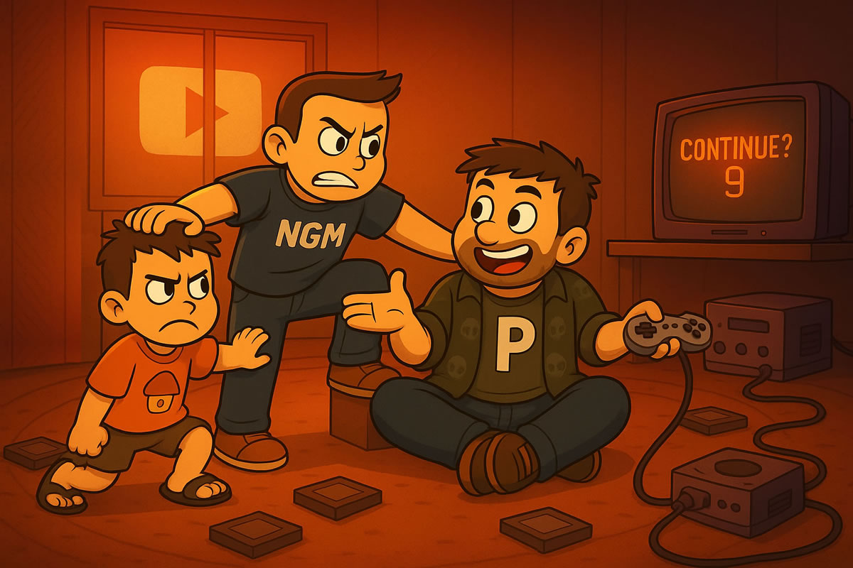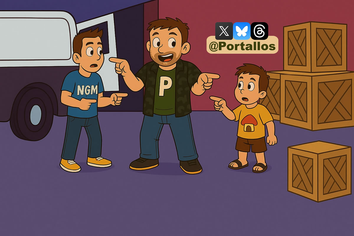 Então veio a ideia de mais de um alter ego, em diferentes faixas etárias. Então surge o personagem mais jovem, cabelo de topete, camisa azul e com as letras “NGM“, uma representação pessoal anterior ao Portallos, porque tudo isso começou em um fórum, que por muitos anos era conhecido como Fórum NGM (“Nós, Games, Merecemos”), e a primeira versão desse fórum era azul, daí a camisa de tal cor. Logo descobri que me senti confortável chamando-o de Mac, só uma abreviação do meu sobrenome, já que na adolescência muitos me chamavam apenas pelo sobrenome.