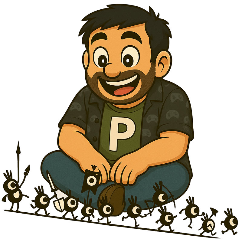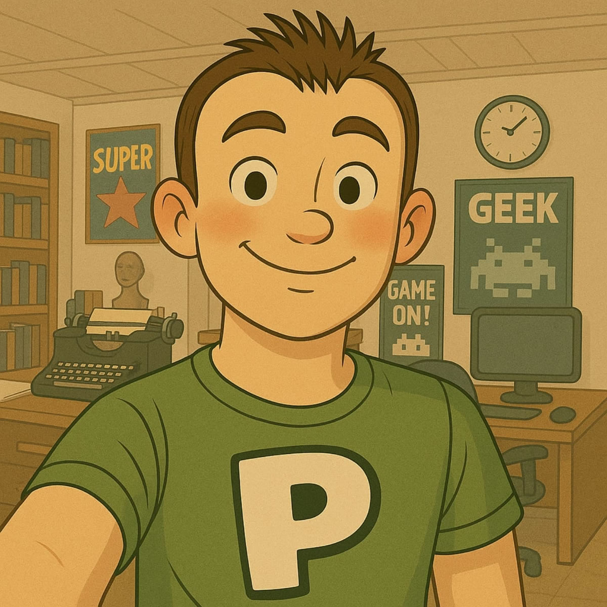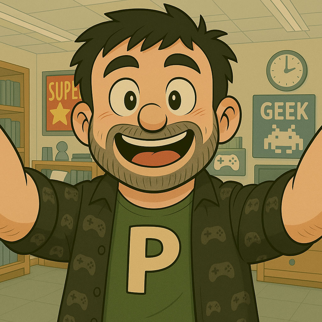 Então, depois de muitos modelos e testes, cheguei ao carinha que está no centro da arte que abre este texto, um personagem quase sempre com um enorme sorriso, sempre vestindo uma camiseta com o querido “P” do logo do Portallos, habitualmente usando uma camisa estampada de controles de videogame (por sinal, eu tenho uma camisa assim). Personagens precisam de nomes certo? Inicialmente o chamei de “Editor“, por motivos óbvios, mas em pouco tempo me peguei chamando-o de Edd.