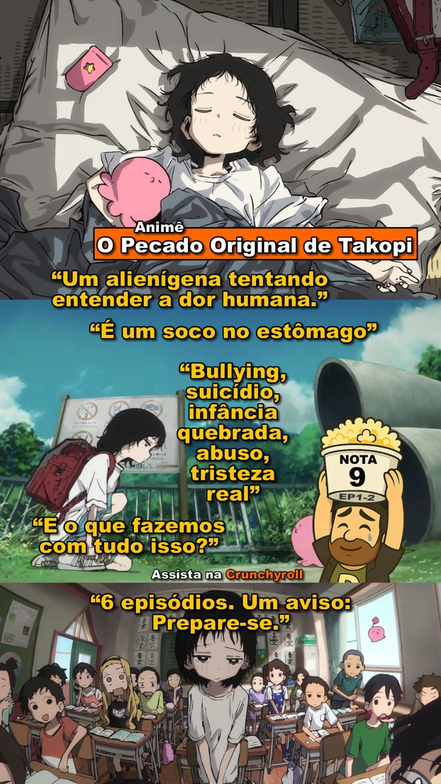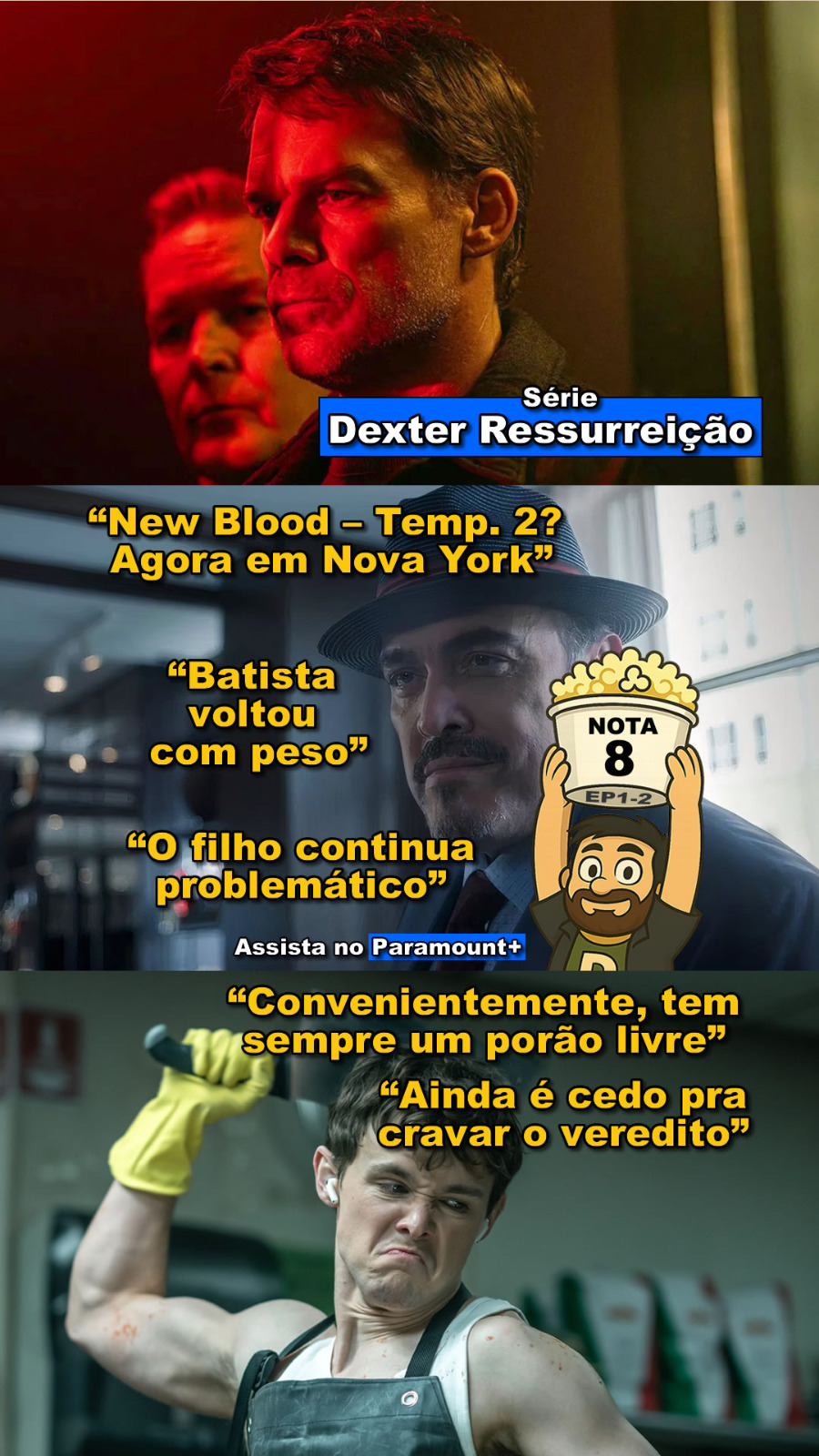 As reels ainda estão em constante evolução. O formato ainda está visualmente bem poluído, mas tem uma certa intenção proposital para ser assim, quero que seja um projeto gráfico que chame a atenção no feed de qualquer um, mesmo que isso o obrigue a colocar o dedo no celular para ler o que está escrito. E o Edd está ali, com um balde de pipoca (com diferentes expressões) atribuindo uma nota, e uma versão em pixel art quando se trata de um reels de um jogo.