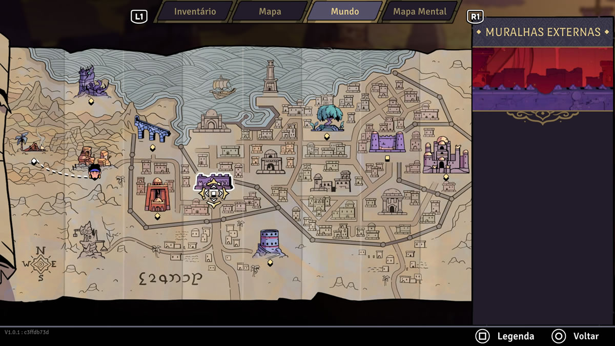 Um elemento muito bacana dessa construção narrativa em The Rogue Prince of Persia é que a trama vai se costurando ao longo de novas partidas, por meio de um sistema que o jogo chama de Mapa Mental. O que você pode aprender ao desbravar uma área, permitirá que você decida quais as próximas áreas que precisará explorar ou desbravar, na atual partida ou quando morrer e retornar ao terceiro dia da invasão. E então, poderá decidir ir para uma outra área, afim de descobrir algo que você encontrou na partida anterior.