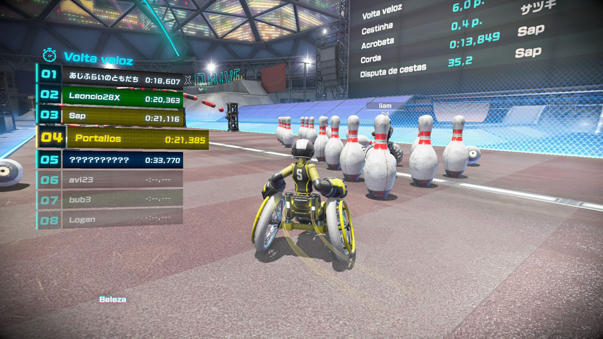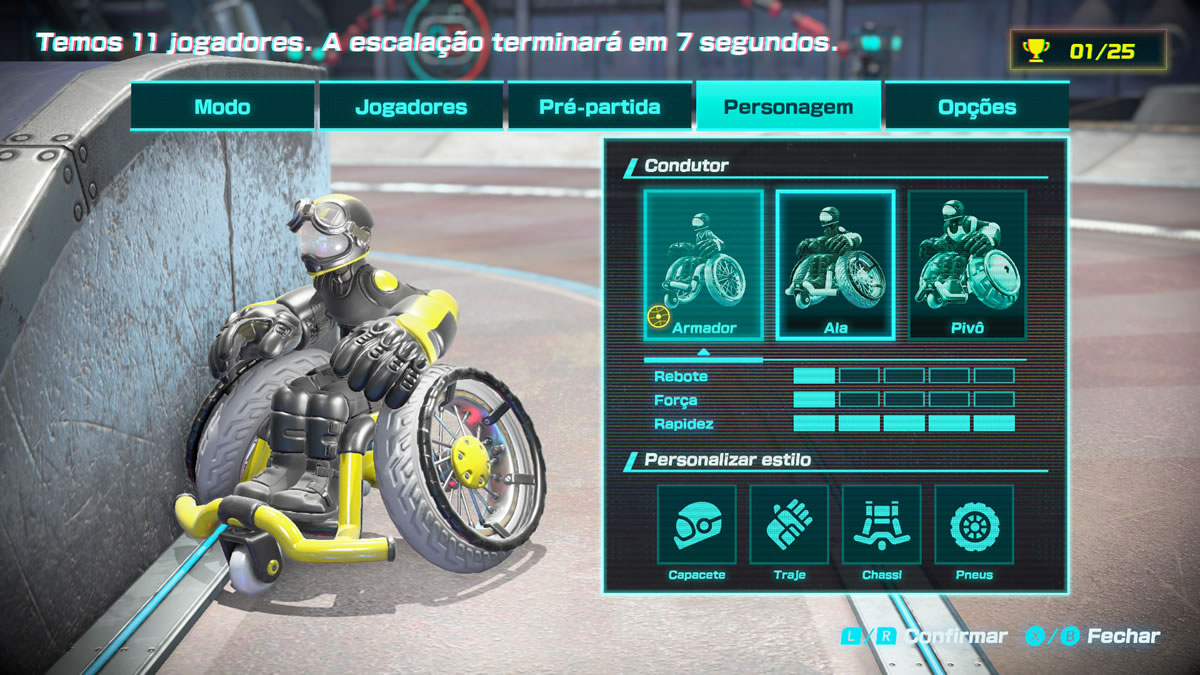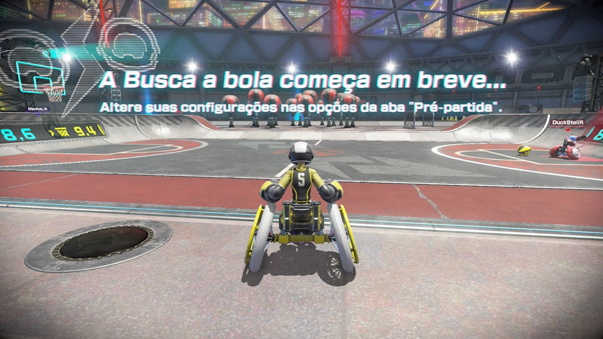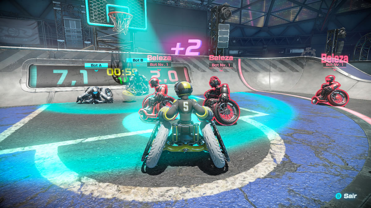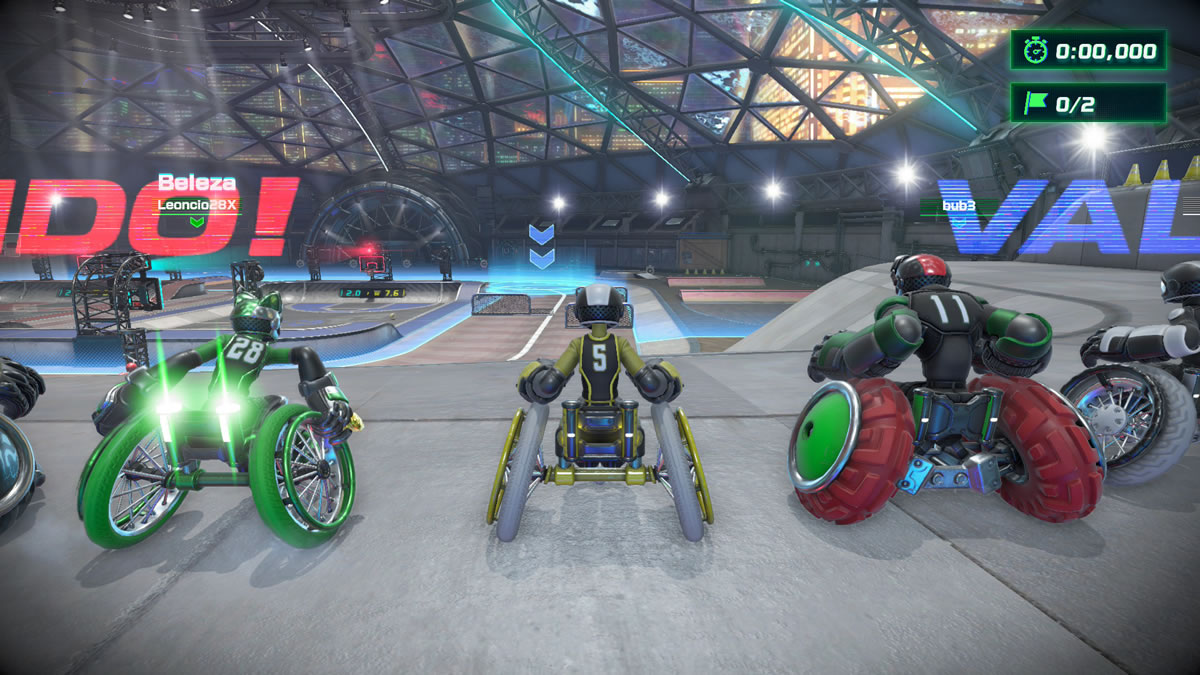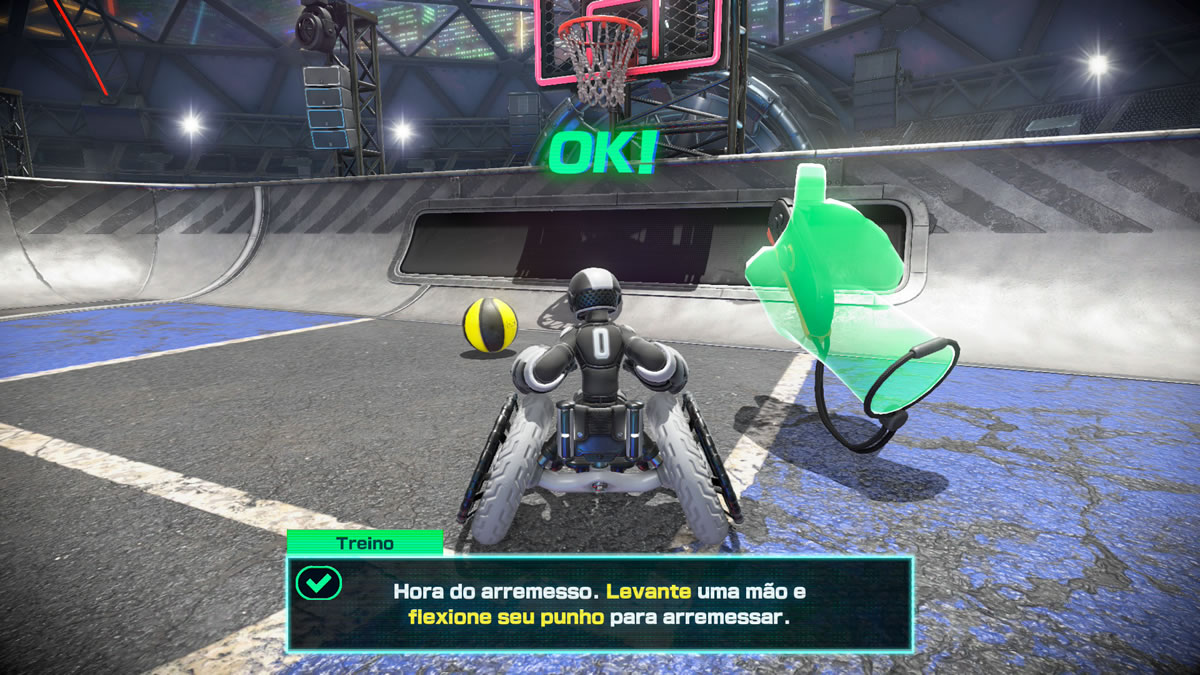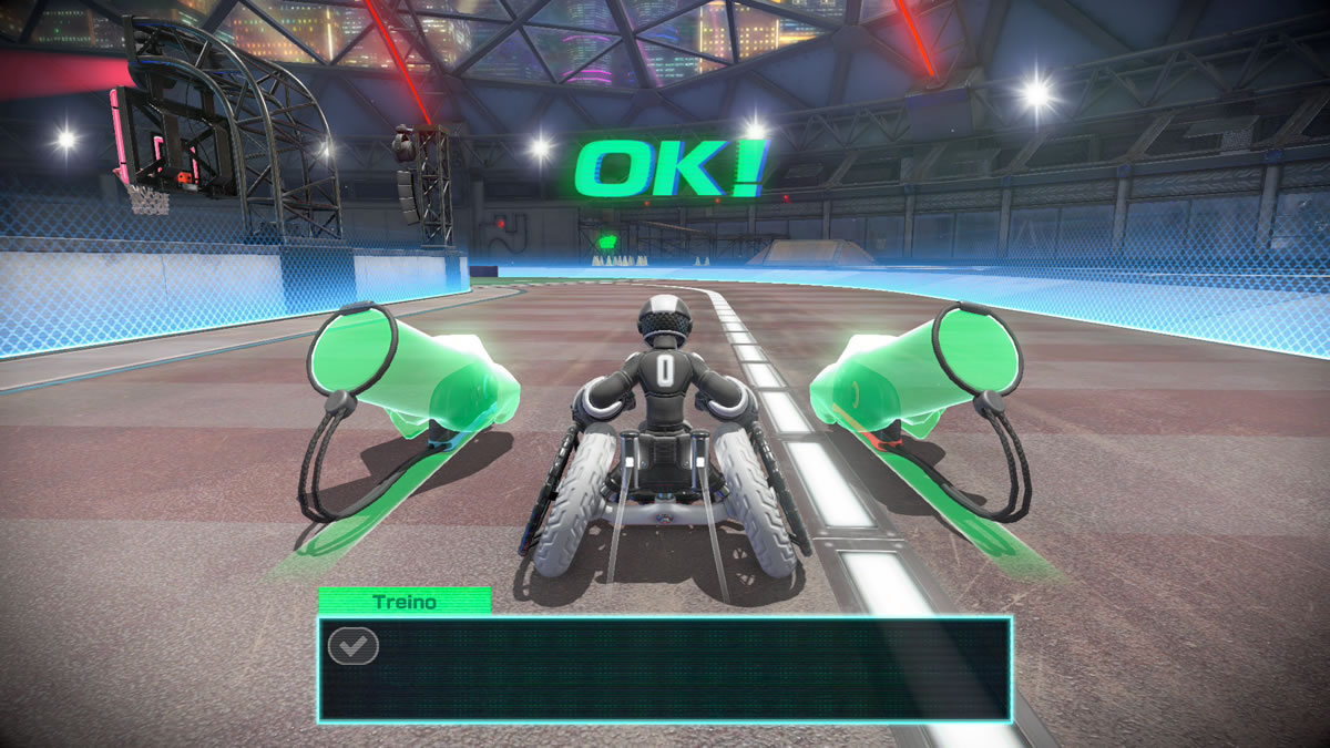Tenha em mente o seguinte, o jogo quer que você use os joy-cons 2 como se estivesse segurando os lados das cadeiras de rodas. E é preciso flexionar ambos os braços pra frente, como se estivesse empurrando as rodas da cadeira. Mas a força aplicada nesse movimento também implica na força que seu personagem irá empurrar as rodas no jogo, e com isso ter ou não velocidade.