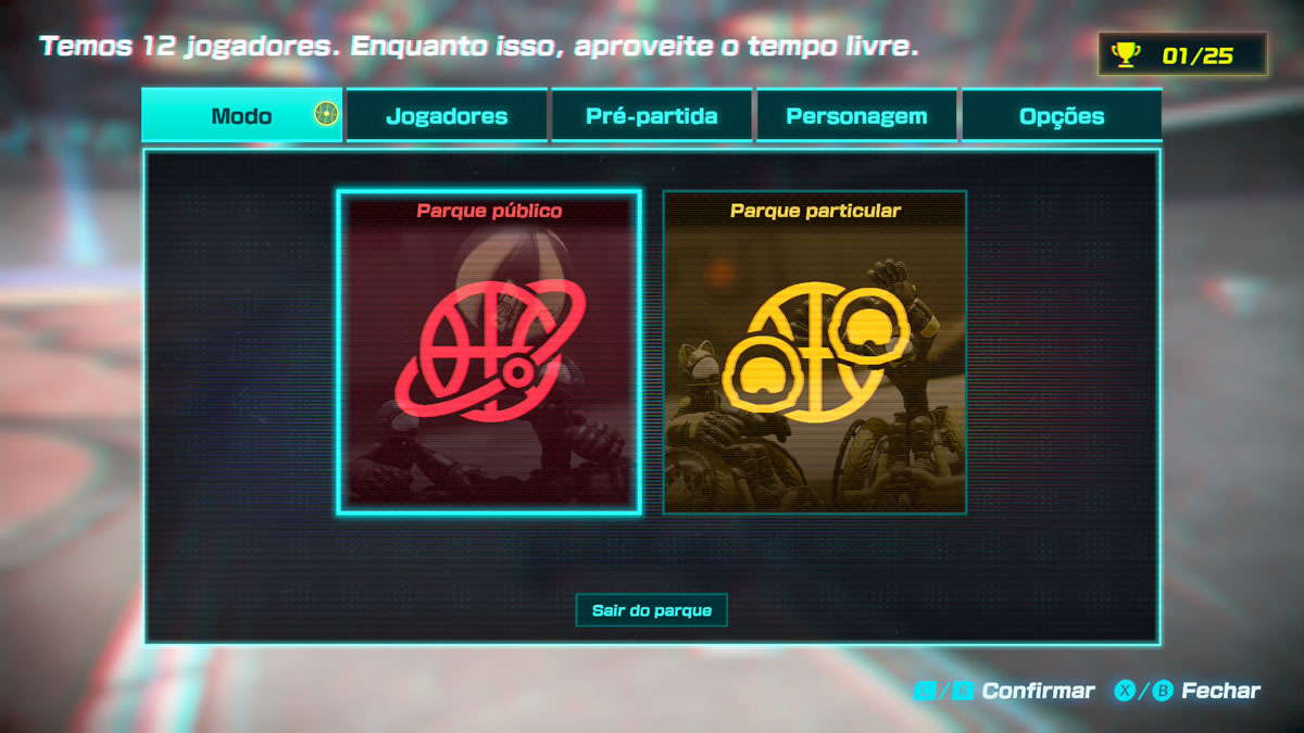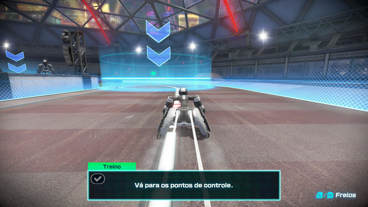 Uma vez conectado, ou determinado que ficará offline, o jogo irá te liberar para o que ele chama de Parque. Esse local é uma imensa arena coberta por um domo de ferro. Trata-se de um imenso circuito olímpico, com duas quadras e diversas rampas e atividades extras em seu entorno, para a realização de treinos e atividades que vão servir para você se adequar aos controles do jogo.