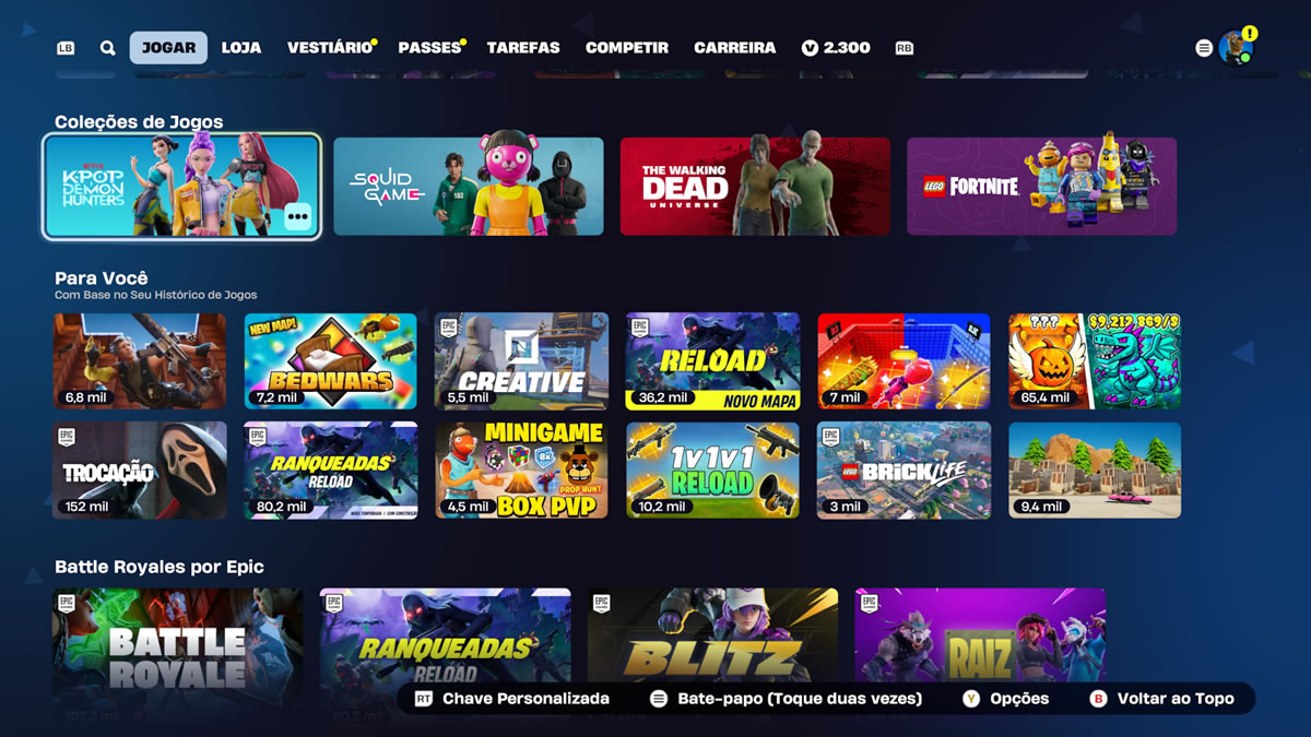Contudo, o que mais me causou estranhamento ao iniciar Fortnite após 2 anos sem contato com o jogo foi o caótico menu atual. Sabe o que me lembrou? Do caos que são jogos com muitos modos de comunidade, como Roblox, que apesar de não jogar, estou sempre vendo meu filho se entreter com esse jogo, que por ser gratuito, toda a criançada da idade dele joga.
