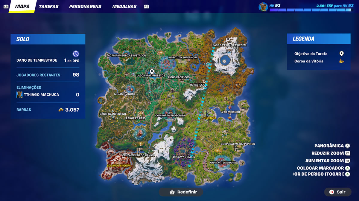 Falando no Passe de Temporada, o jogo continua extremamente agradável nesse sentido. Comecei a jogar próximo ao dia 9 de outubro, quando Fortnitemares foi lançado, e faltando alguns dias até o término do evento, e da atual temporada (que vira dia 1º de novembro), meio que fiz 92% de todo o Passe. Estou na última aba do mesmo, próximo de desbloquear a skin de Ranger Branco.