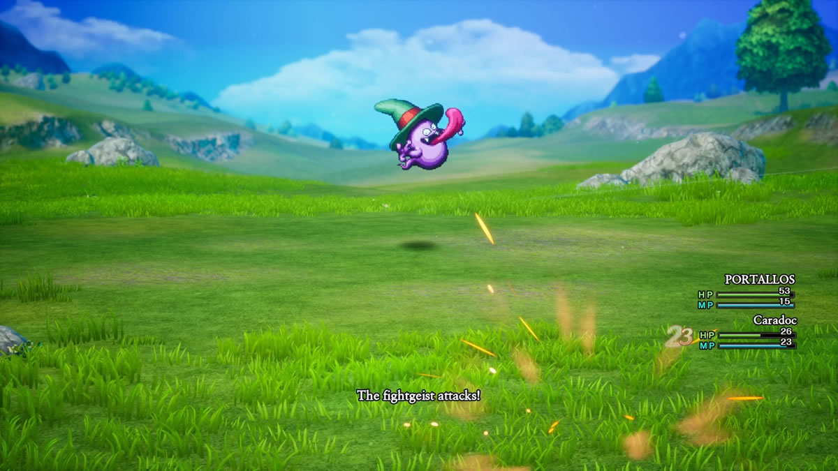 Falando em batalhas, elas também ocorrem dentro da perspectiva de ambos os jogos originais, ou seja, na visão frontal em primeira pessoa. Essa é uma característica que não vingou nos RPGs mais modernos, mas que curiosamente continua com muito sucesso em jogos de tiro. Lembrar que os primeiros Dragon Quest possuem essa mesma perspectiva é muito interessante, ainda que mecanicamente não impactem a jogabilidade. Só é estiloso mesmo.