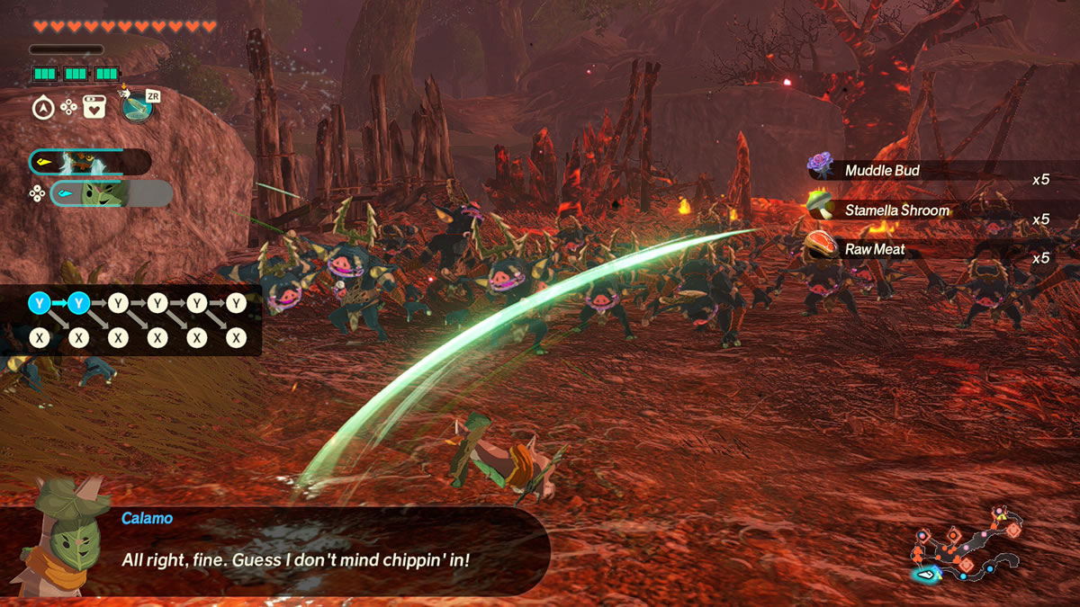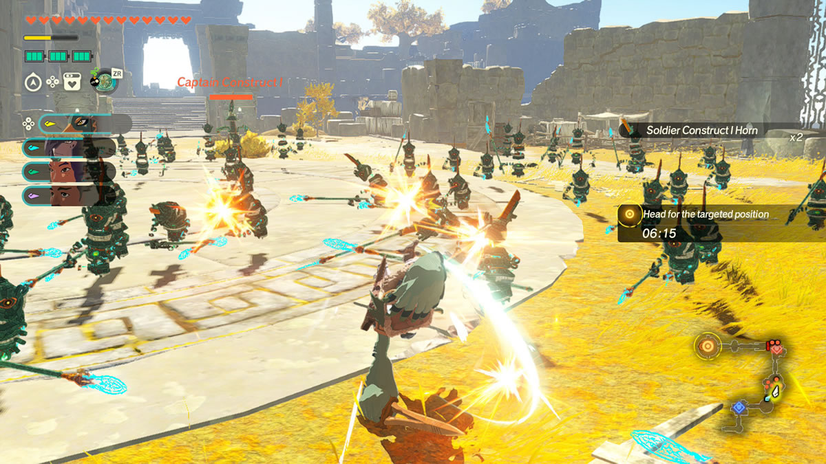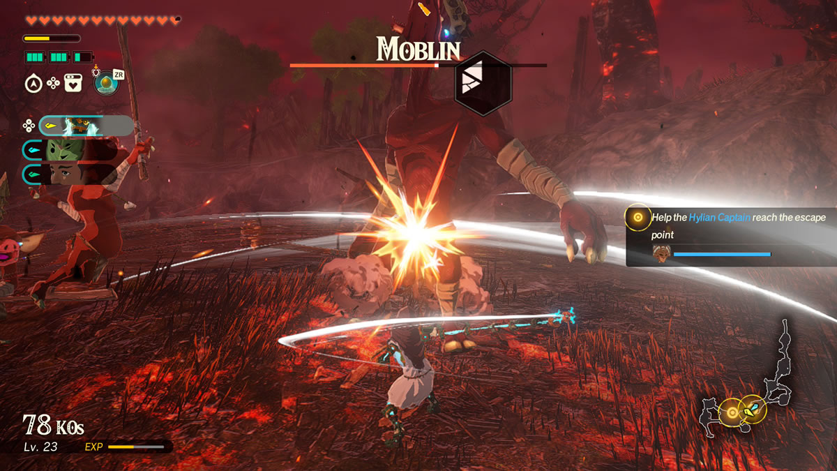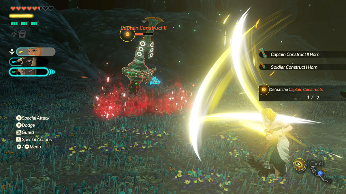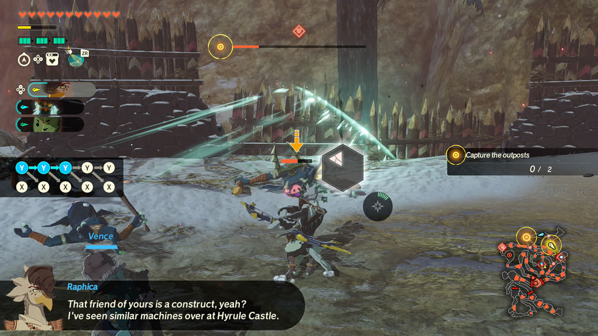 Antes de iniciar uma missão, o jogador pode selecionar alguns membros, seja da equipe Zelda ou da equipe do Misterioso Construto, para ir junto para o estágio. Durante a fase, estes personagens preenchem uma barra de sinergia especial, e assim que ela fica cheia, é permitido lançar um poderoso ataque devastador com ambos os personagens. Também é possível mandar alguém para um ponto certo do mapa, enquanto você está indo para outro ponto. Em teoria seria para que o aliado lutasse uma batalha enquanto você lida com outra em outro local, mas o que o jogo entende é “manda o aliado lá, e ele só fica tomando o tempo e distraindo chefe, enquanto lido com esse outro aqui“. Isso impede que um NPC de história caia em batalha. E depois, o jogador pode trocar em tempo real com qualquer um de sua equipe, assim não é preciso fazer toda a travessia do ponto A com o B, pois você já tem um personagem posicionado em B, a qual pode utilizar e lutar. Bem prático.