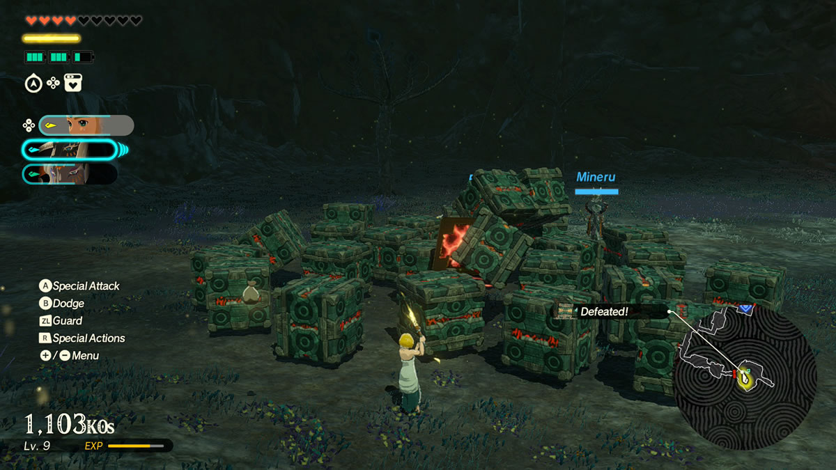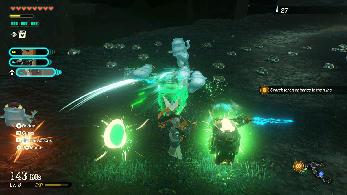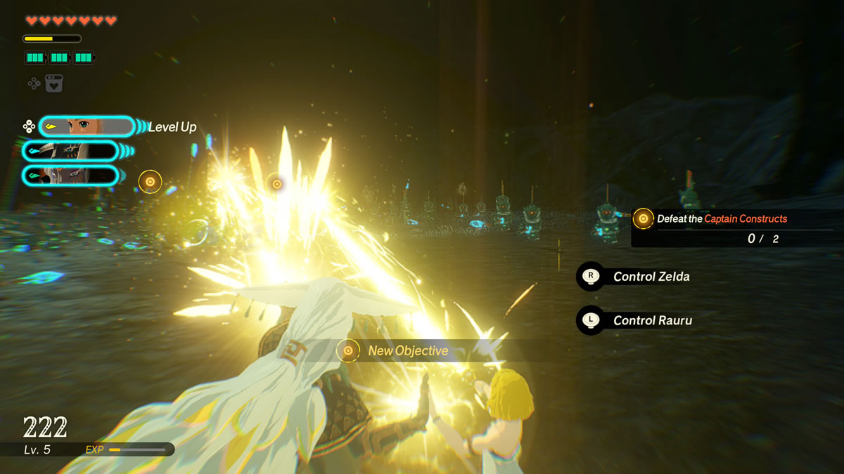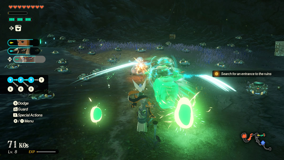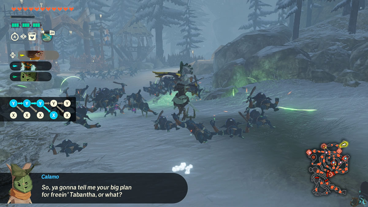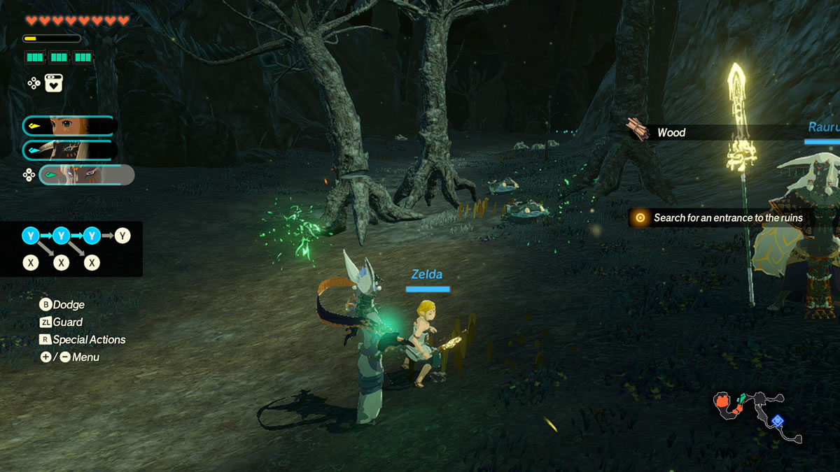 Antes de iniciar uma missão, o jogador pode selecionar alguns membros, seja da equipe Zelda ou da equipe do Misterioso Construto, para ir junto para o estágio. Durante a fase, estes personagens preenchem uma barra de sinergia especial, e assim que ela fica cheia, é permitido lançar um poderoso ataque devastador com ambos os personagens. Também é possível mandar alguém para um ponto certo do mapa, enquanto você está indo para outro ponto. Em teoria seria para que o aliado lutasse uma batalha enquanto você lida com outra em outro local, mas o que o jogo entende é “manda o aliado lá, e ele só fica tomando o tempo e distraindo chefe, enquanto lido com esse outro aqui“. Isso impede que um NPC de história caia em batalha. E depois, o jogador pode trocar em tempo real com qualquer um de sua equipe, assim não é preciso fazer toda a travessia do ponto A com o B, pois você já tem um personagem posicionado em B, a qual pode utilizar e lutar. Bem prático.