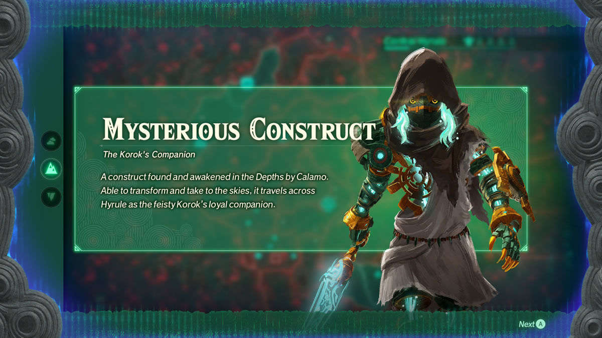Outro aspecto que pode causar divergências entre fãs, ainda que não tenha me incomodado, é justamente o personagem inédito, mencionado no parágrafo acima. Trata-se de um misterioso construto zonai, que em boa parte da trama, literalmente recebe esse nome (Mysterious Construct). Esse personagem é despertado no passado, graças a intervenção de um Korok chamado Calamo, que o descobre em uma caverna.