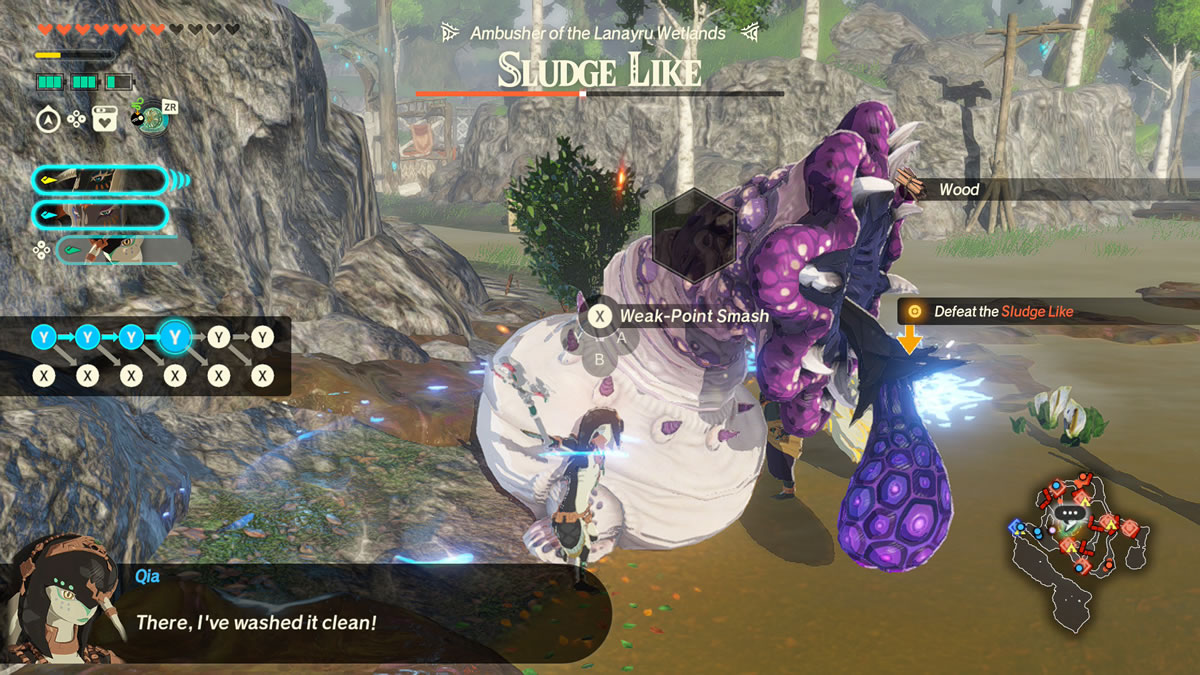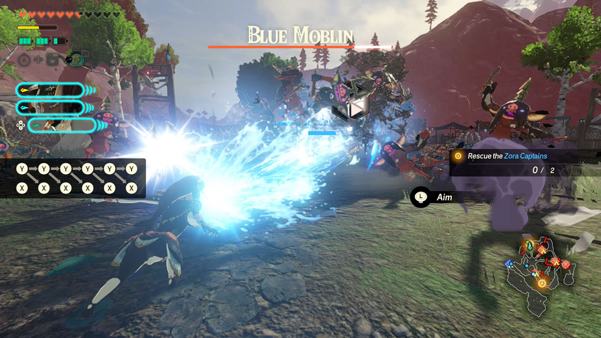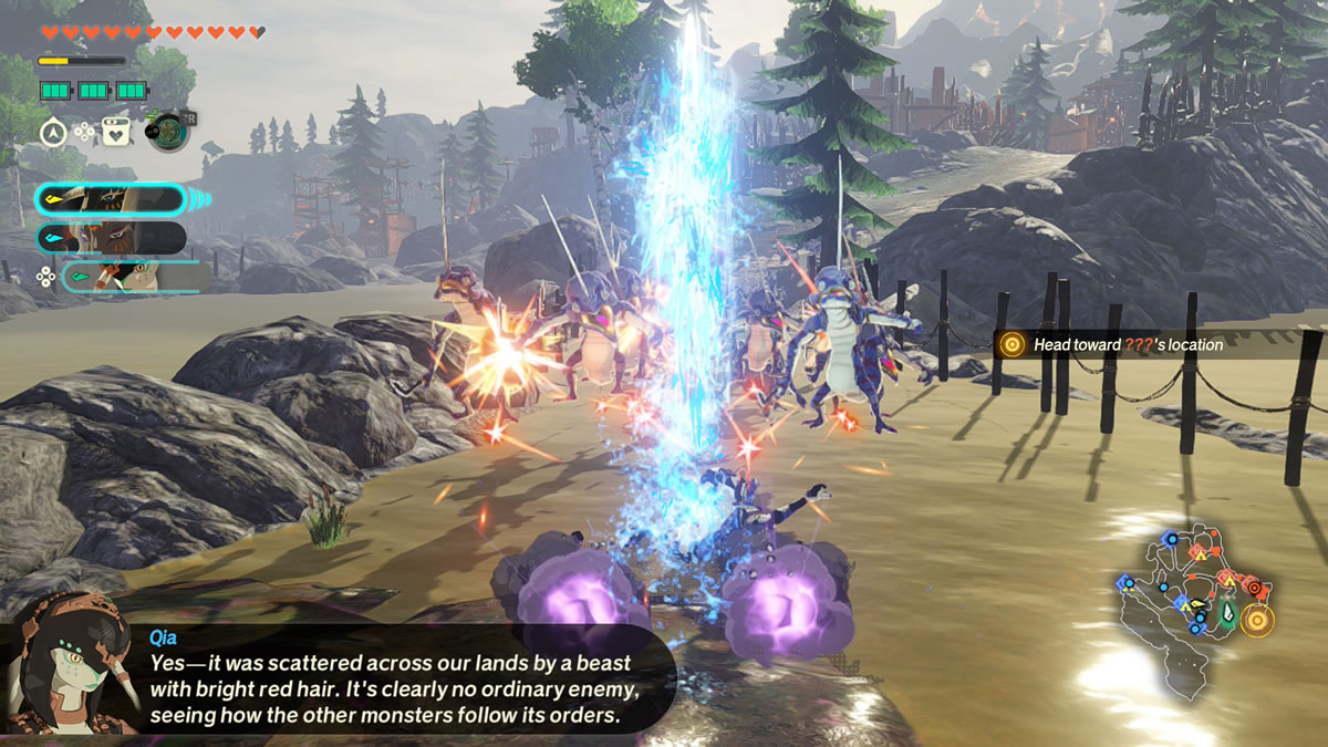 E falando de poderes elementais, isso também está presente nos inimigos, e em dispositivos zonais que o jogador irá destravar ao longo da aventura. Então, por exemplo, inimigos com lama, possuem uma defesa adicional ativa, assim personagens, como um Qia, rainha zora, possuem golpes que criam bolsões de água que permitem lavar a lama destes inimigos, tanto da horda, como dos chefes, facilitando a quebra de seus escudos, mas também há dispositivos zonais, do tipo hidrante, que podem ser equipados em outros personagens, para que eles também possam lavar a lama dos inimigos.