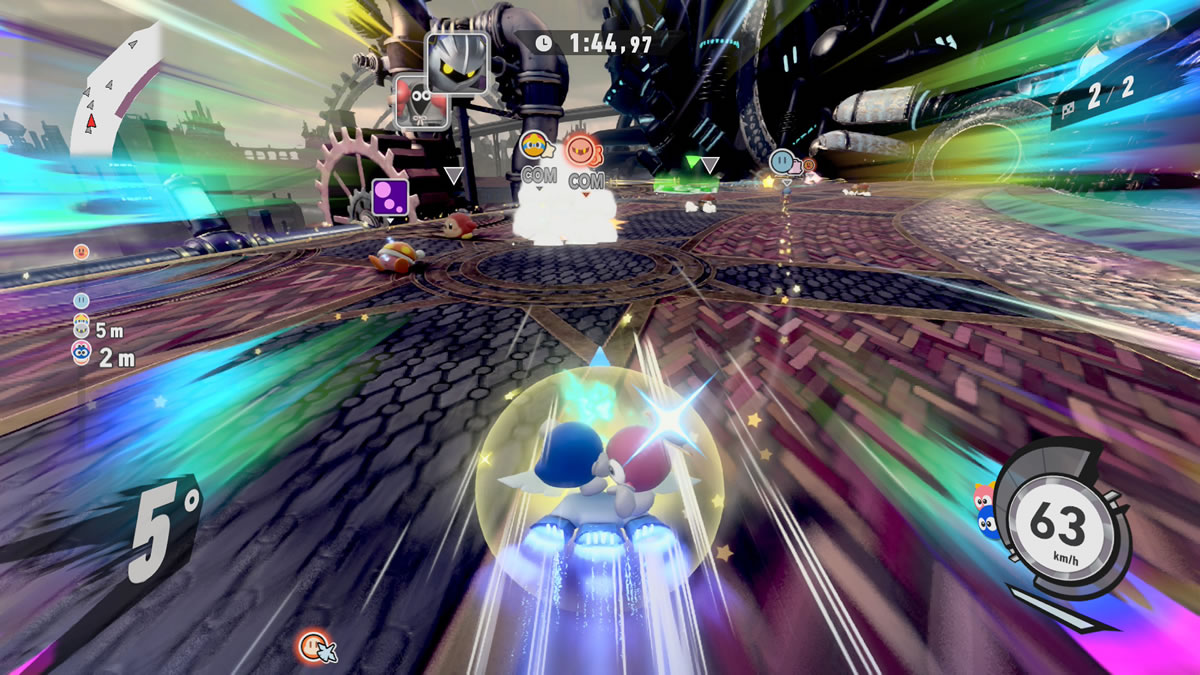 Sob desenvolvimento direto de Masahiro Sakurai — criador de Kirby e figura central por trás de Super Smash Bros. —, o jogo amplia a proposta com mais modos, veículos, personagens, opções de customização, suporte online e uma apresentação muito mais refinada. Algumas pistas clássicas retornam recriadas, mas a sensação geral é de crescimento estrutural, não de reciclagem.